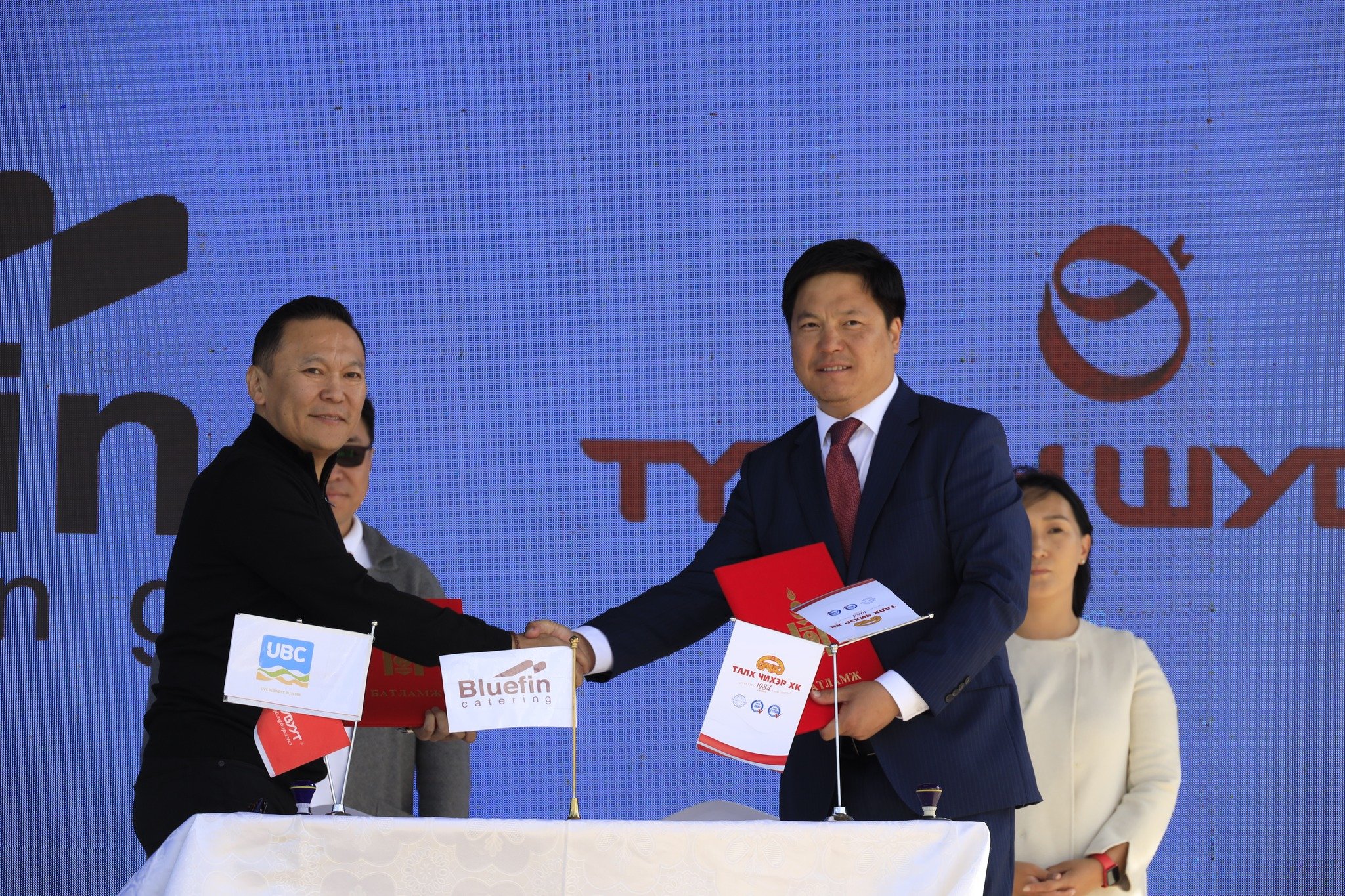 - Блүфин Катеринг ХХК нь Талх чихэр ХХК, Түмэн шувуут ХХК, Юу Би Си брэнд ХХК-тай гурилан бүтээгдэхүүн, мах, махан бүтээгдэхүүн болон чацарганаар үйлдвэрлэсэн бүтээгдэхүүнийг нийлүүлэх, хангах санамж бичгийг,
