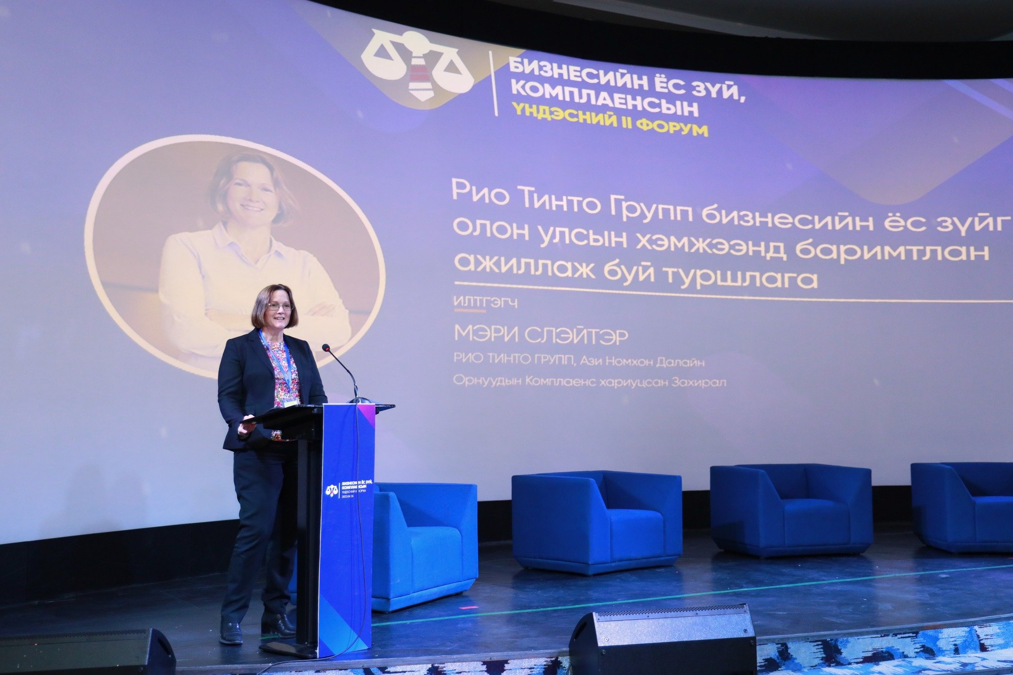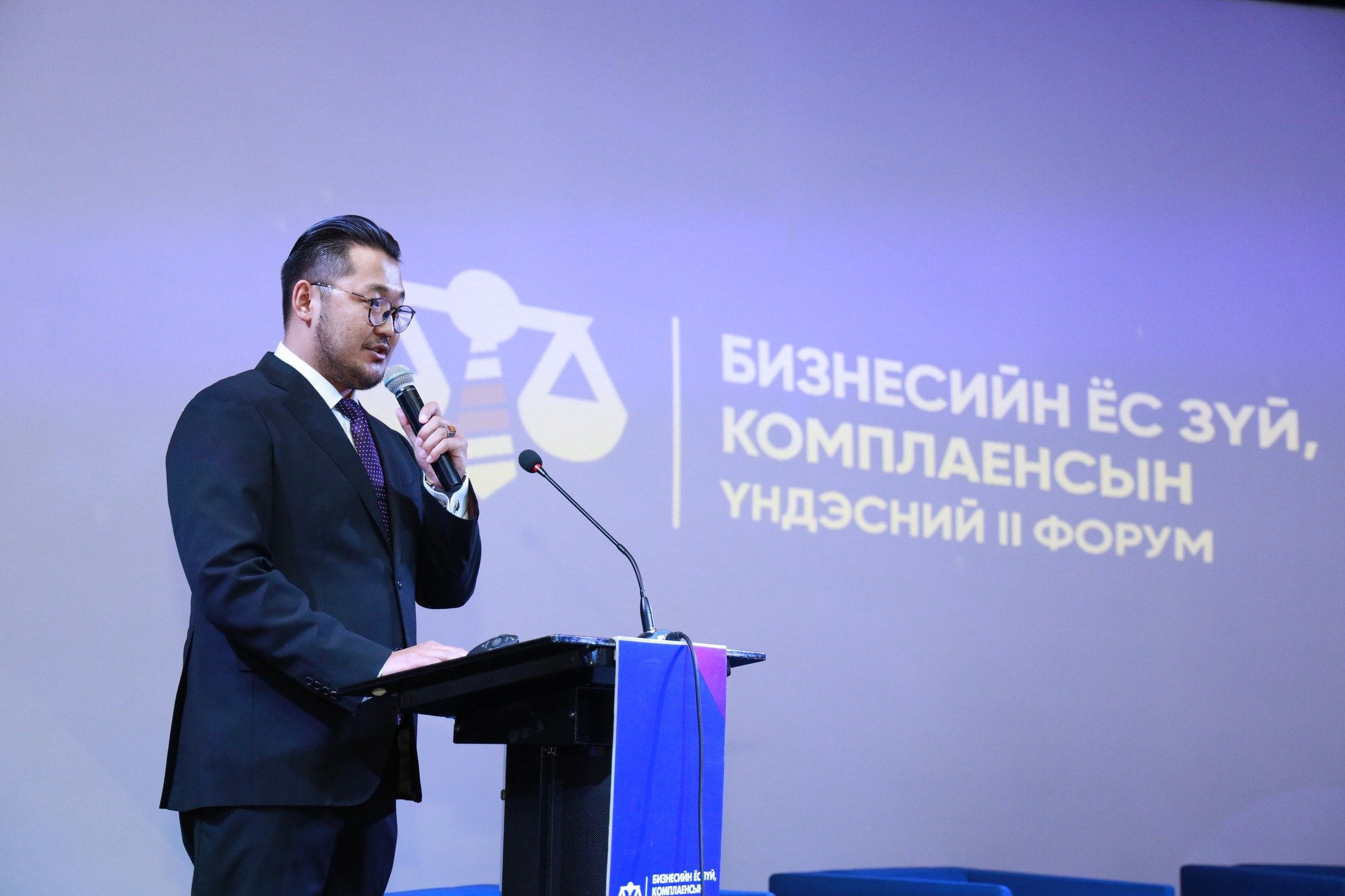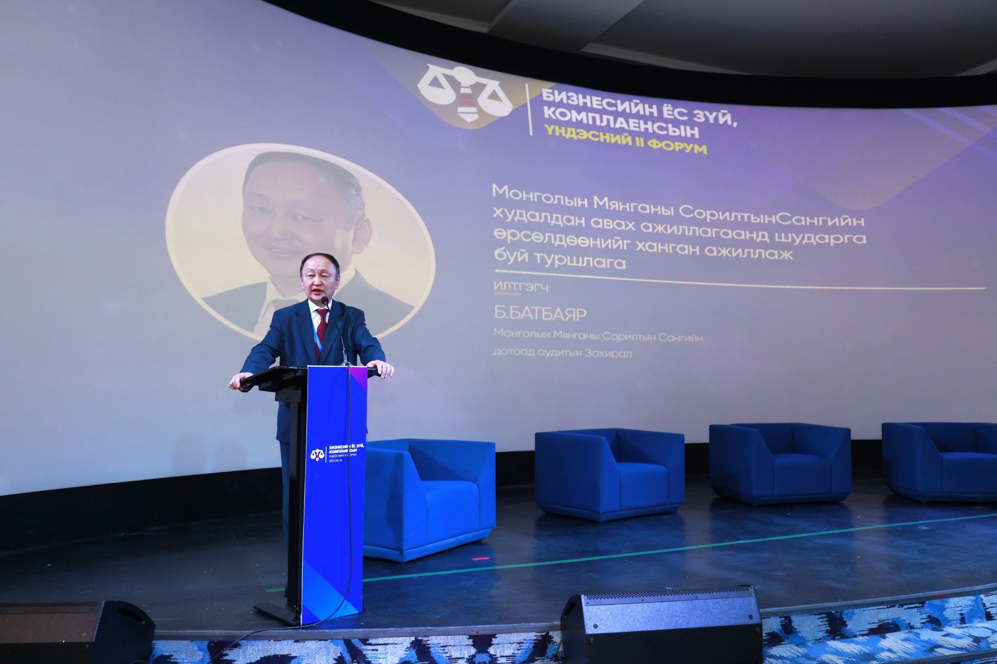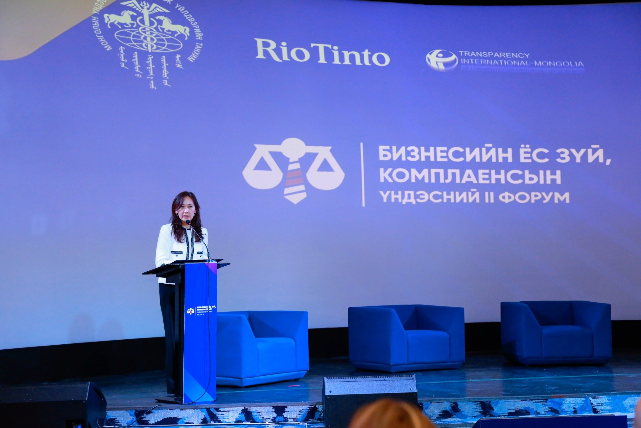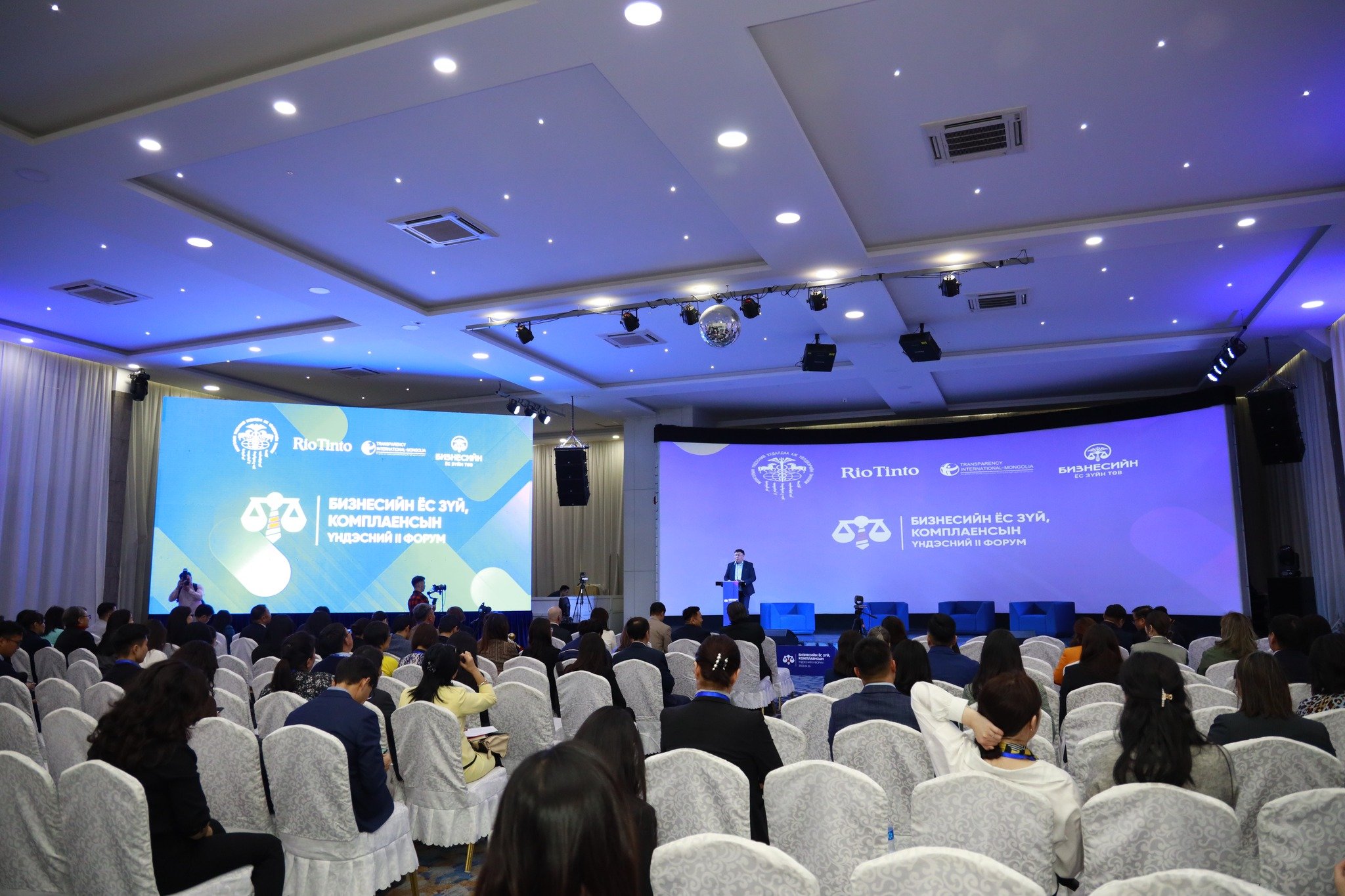 МҮХАҮТ, Рио Тинто Монгол компани, Транспэрэнси Интернэшнл ТББ хамтран хэрэгжүүлж буй “Бизнесийн ёс зүй, шударга байдлыг бэхжүүлэх” төслийн хүрээнд “Бизнесийн ёс зүйн төв” болон МҮХАҮТ-ын дэргэдэх Комплаенсын зөвлөлөөс “Бизнесийн ёс зүй, Комплаенсын Үндэсний II форум”-г зохион байгууллаа. Форумд МҮХАҮТ-ын дарга Т.Дүүрэн, Рио Тинто Монгол ХХК-ийн гүйцэтгэх захирал Х.Амаржаргал, Рио Тинто группийн Ази, номхон далайн орнуудын Комплаенс хариуцсан захирал Мэри Слэйтэр, Монголын Мянганы сорилтын сангийн дотоод аудитын захирал Б.Батбаяр, Транспэрэнси интернэшнл Монгол ТББ-ын гүйцэтгэх захирал Э.Мөнхжаргал, МҮХАҮТ-ын дэргэдэх Комплаенсын зөвлөлийн зөвлөх, гишүүд болон бизнес эрхлэгчдийн төлөөлөл 150 гаруй оролцогч танхимаар, орон нутгийн бизнес эрхлэгчид цахимаар оролцов.