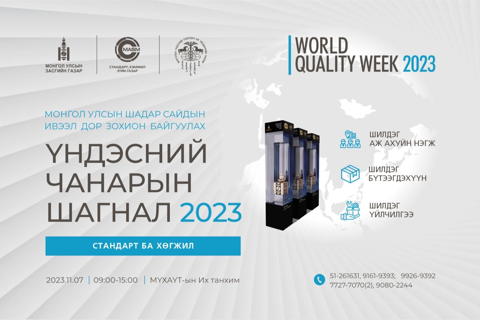 - Шилдэг Үйлчилгээ гэсэн гурван төрлөөр шалгаруулж “ҮНДЭСНИЙ ЧАНАРЫН ШАГНАЛ”-ын ЦОМ, БАТЛАМЖ олгоно.
