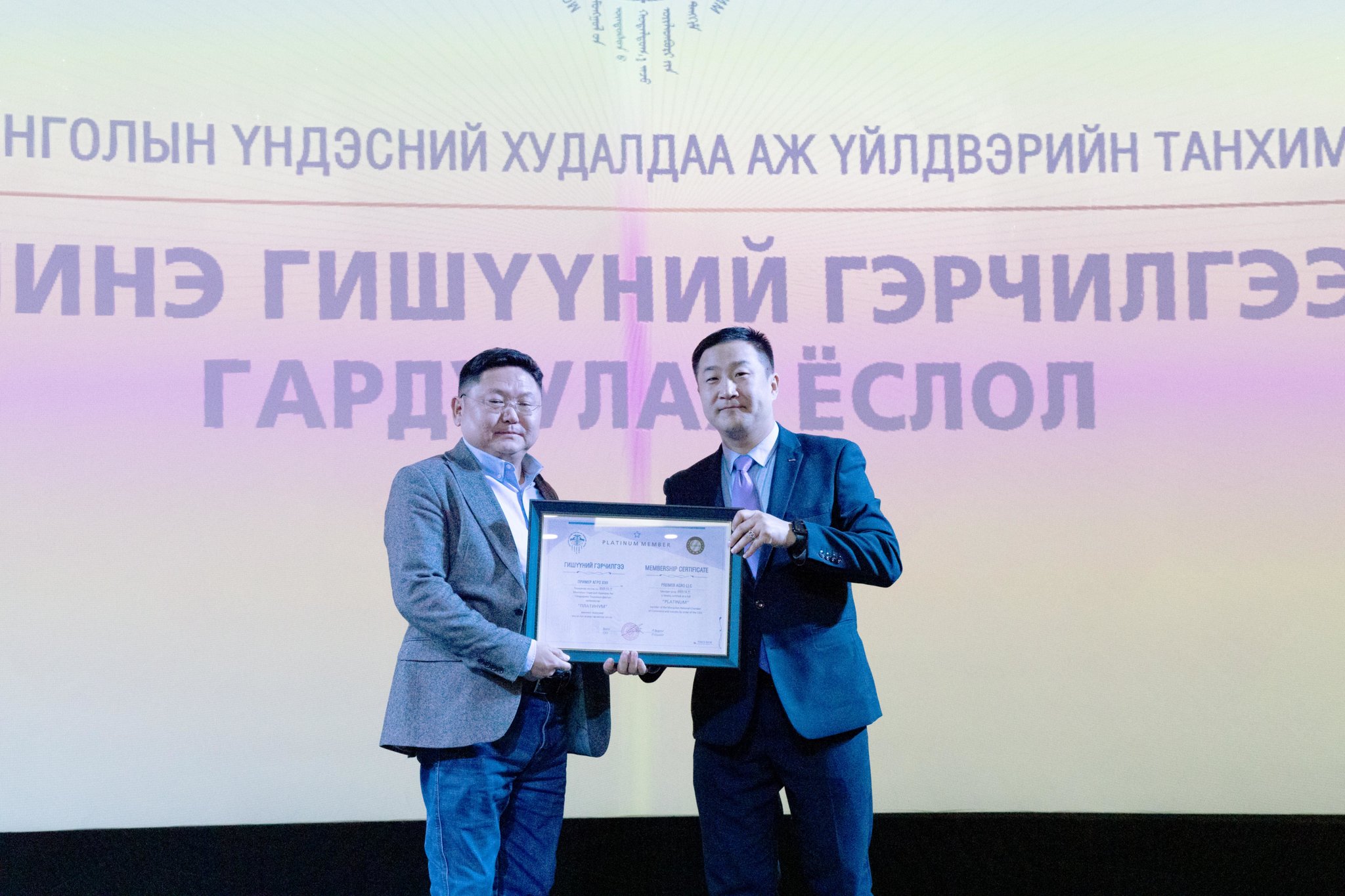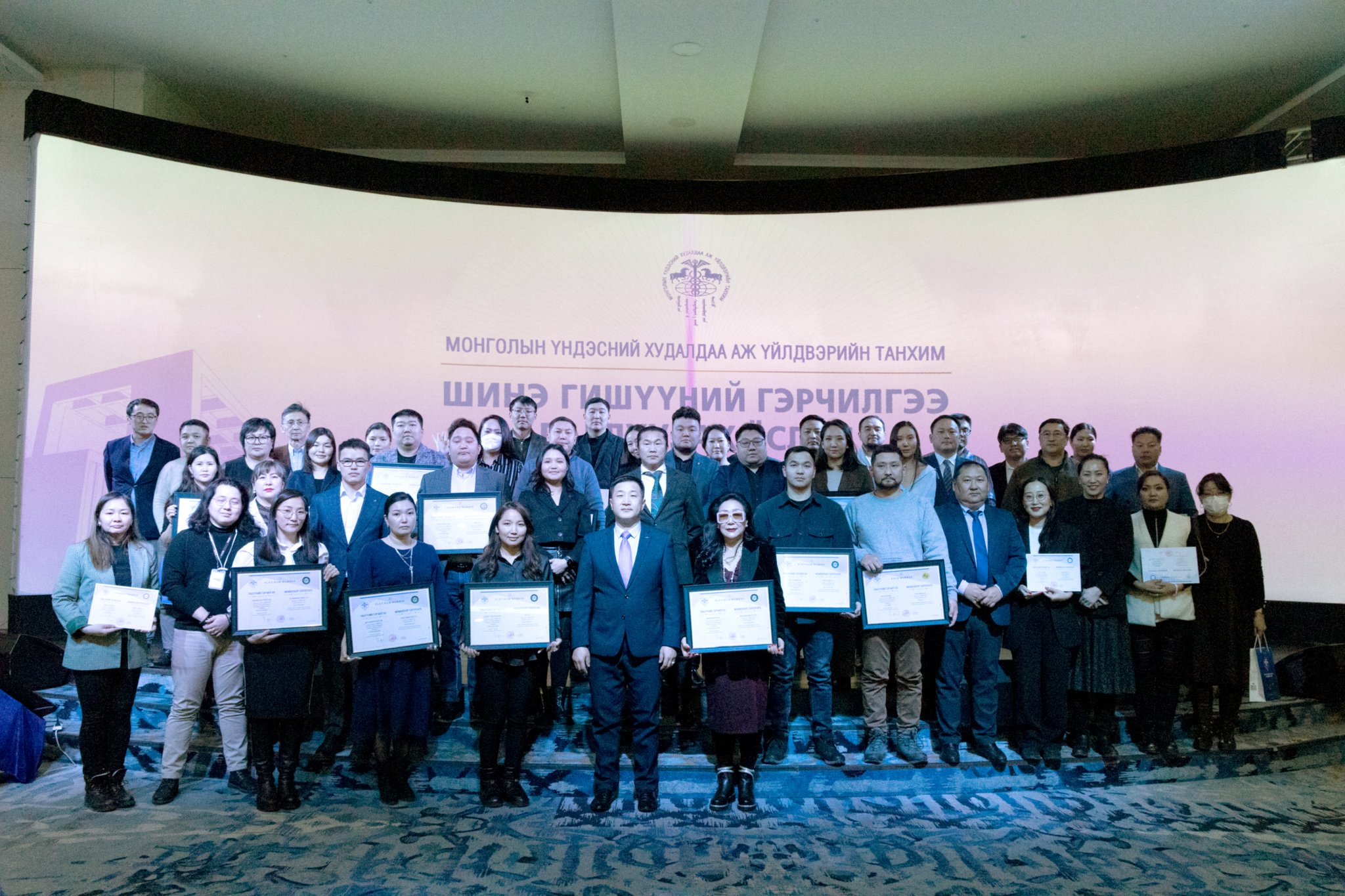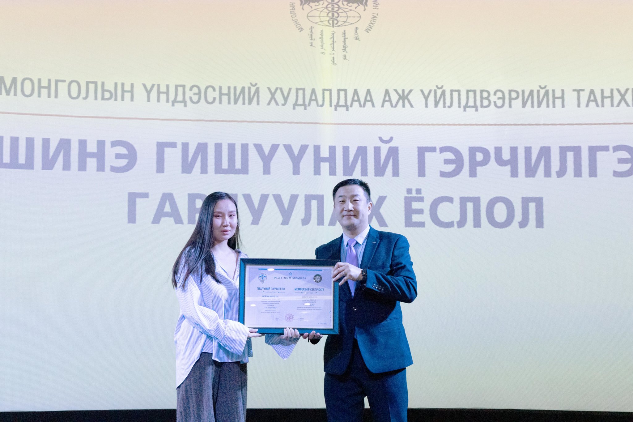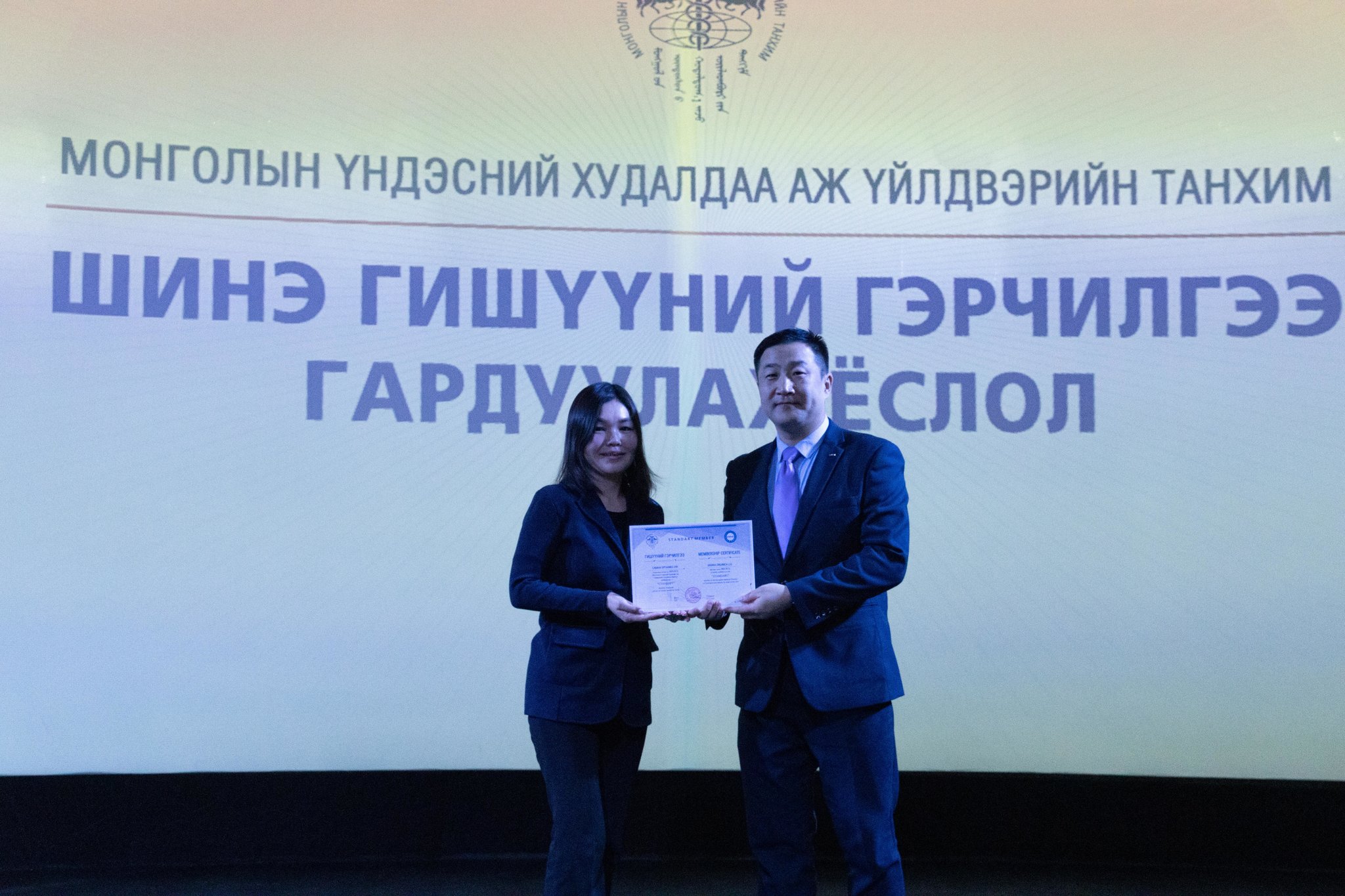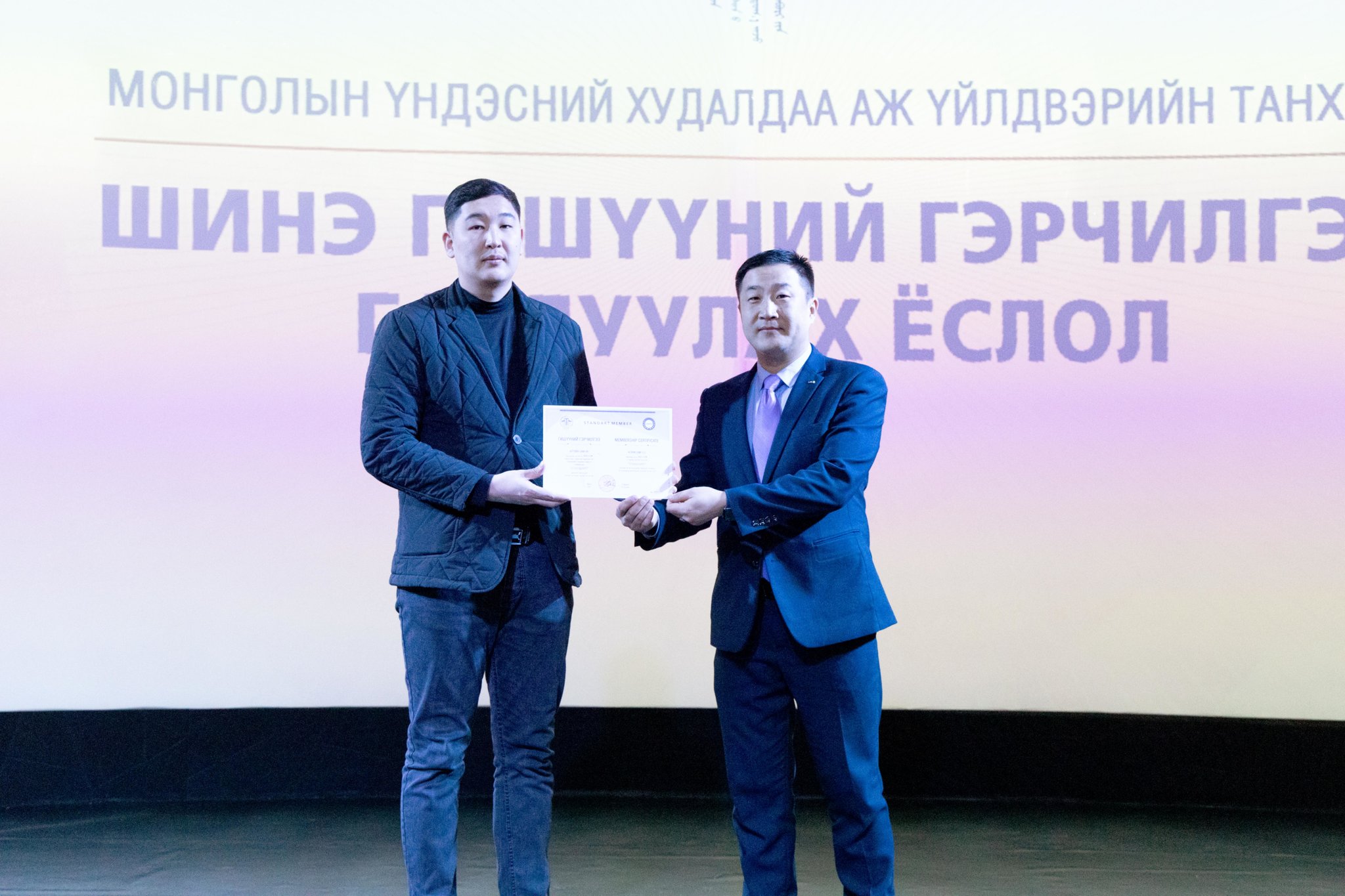 МҮХАҮТ-д 2023 оны дөрөвдүгээр улиралд шинээр элссэн 70 гаруй аж ахуйн нэгжид Гишүүнчлэлийн газрын дарга О.Аюуш гишүүний гэрчилгээг гардууллаа.