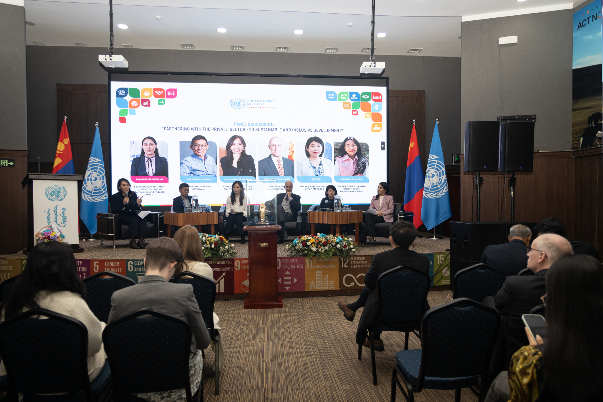Бид Тогтвортой хөгжлийн зорилтыг биелүүлэхийн тулд бизнесийн байгууллагуудтай хэрхэн яаж хамтарч ажиллах вэ гэдгийг өнөөдөр ярилцаж байна. Хувийн хэвшлийнхэн ёс зүйтэй, сайн, зөв бизнесийг эрхэлж, ажилтандаа ээлтэй, бизнесийн ёс зүйг баримталсан үйл ажиллагаа явуулж байж Тогтвортой хөгжилд хувь нэмрээ оруулж, ашиг тусаа хүртэнэ” хэмээсэн юм.