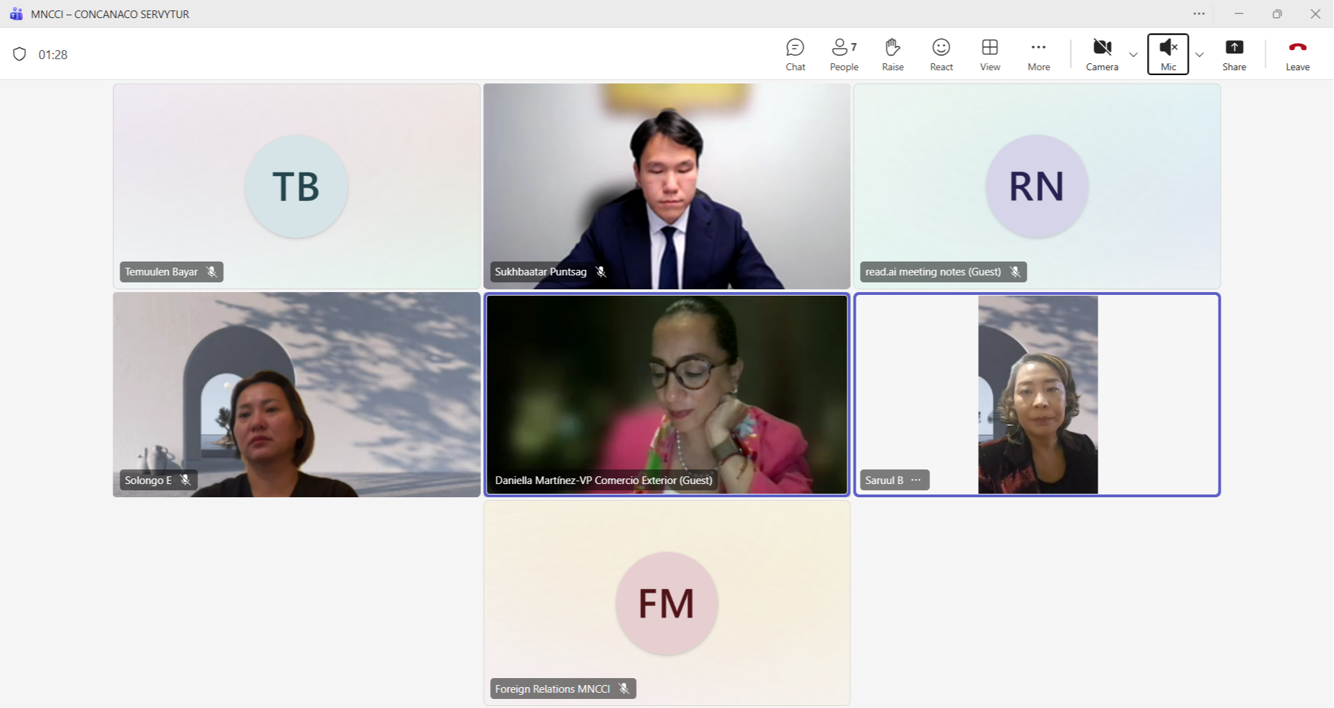 МҮХАҮТ-ын Ерөнхий нарийн бичгийн дарга Б.Саруул Мехсикийн Үндэсний Худалдаа, Үйлчилгээ, Аялал Жуулчалын Танхимуудын холбооны Дэд Ерөнхийлөгч Даниелла Мартинез онлайн уулзалт хийлээ.
