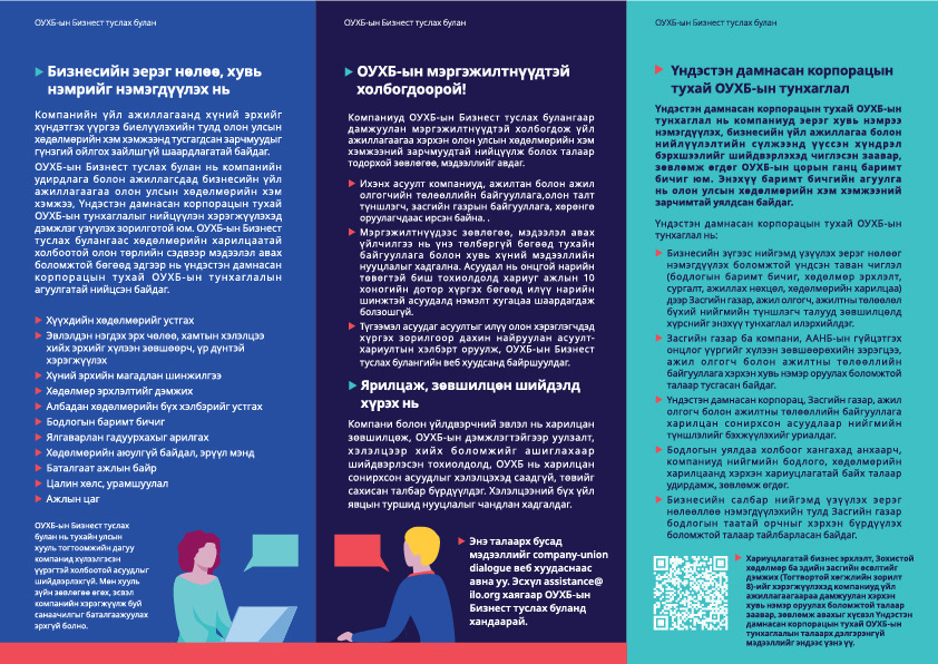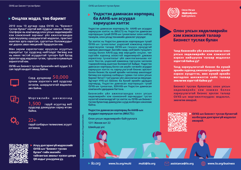 Эдгээр асуудлаар Олон улсын хөдөлмөрийн байгууллага (ОУХБ)-ын “Бизнест туслах булан” (Helpdesk for Business) үйлчилгээг танилцуулж байна.