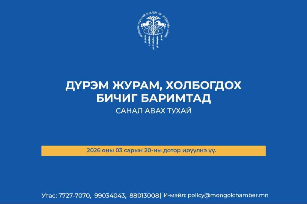 Иймд Та бүхэн үйл ажиллагаа явуулахад саад учруулж буй дүрэм, журам, бусад баримт бичигтэй холбоотой саналаа 20-ны дотор яаралтай policy@mongolchamber.mn мэйл хаягаар ирүүлэхийг хүсье.