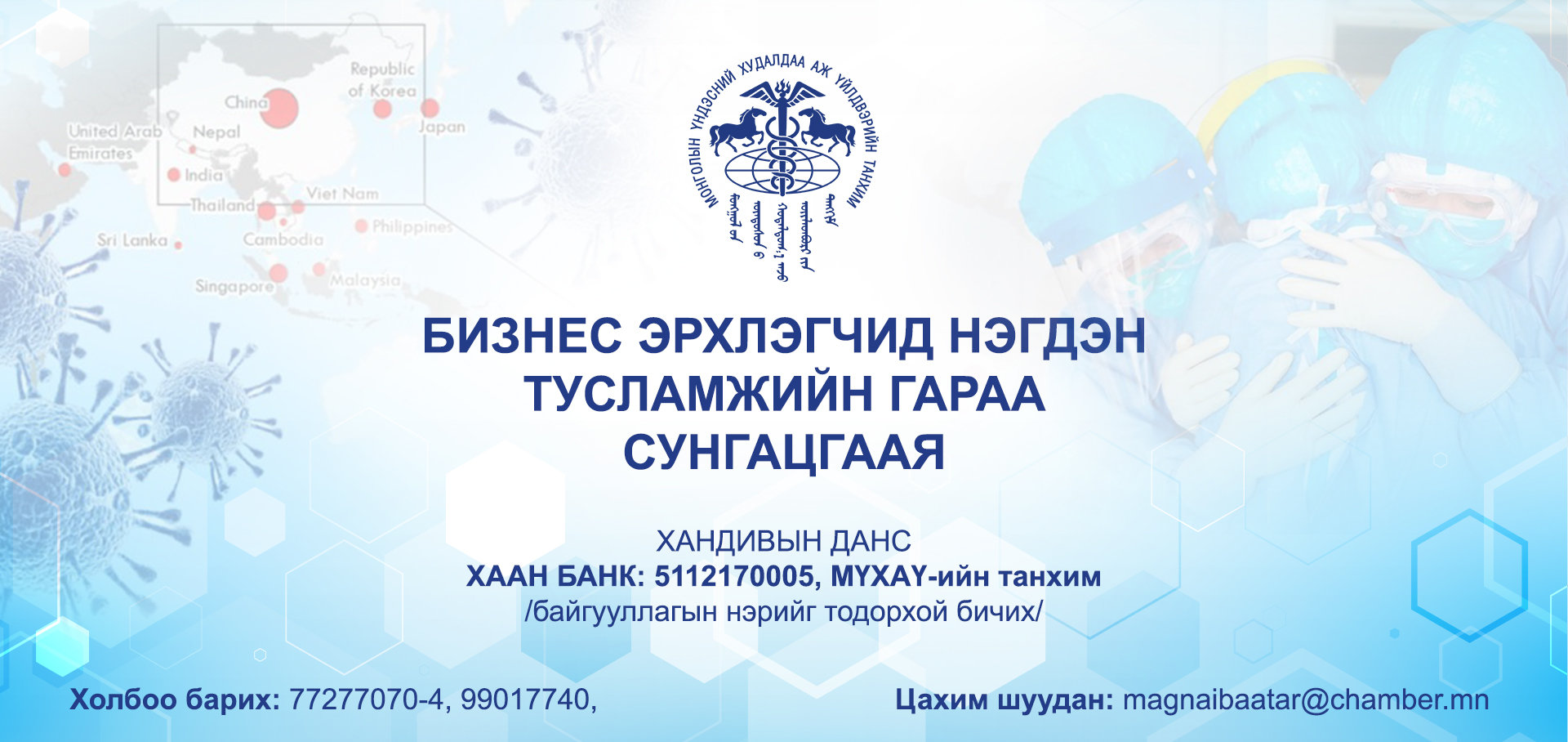 МҮХАҮТ-ын гишүүн байгууллагууд болон бизнес эрхлэгчдээс БНХАУ-д тусламж, дэмжлэг үзүүлэх санаачилга цөөнгүй гарч байгаа учир бизнесийн төлөөллийн гол байгууллага болохын хувьд МҮХАҮТ нэгдсэн зохион байгуулалттайгаар уг хандивыг цуглуулж, зохих газарт нь илгээхээр болж байна.