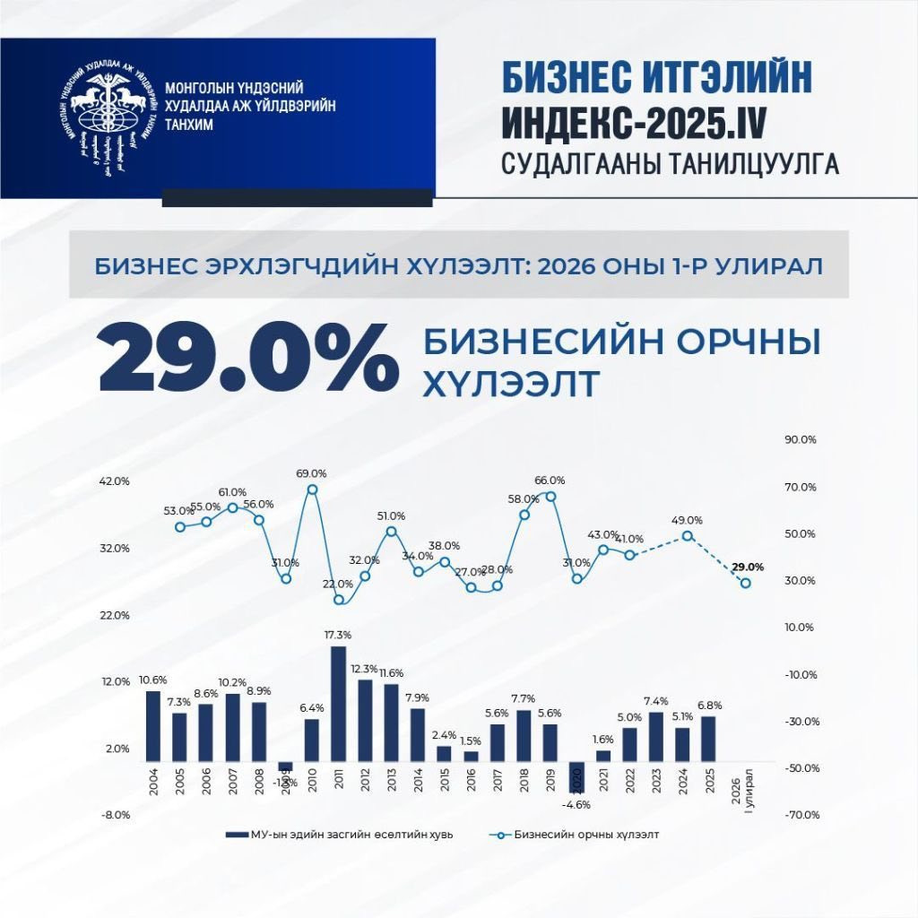 Орчны ерөнхий хүлээлт 29.0%: Бизнесийн орчинд тодорхой сорилтууд байгааг энэ үзүүлэлт харууллаа.