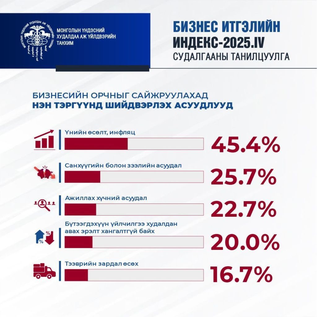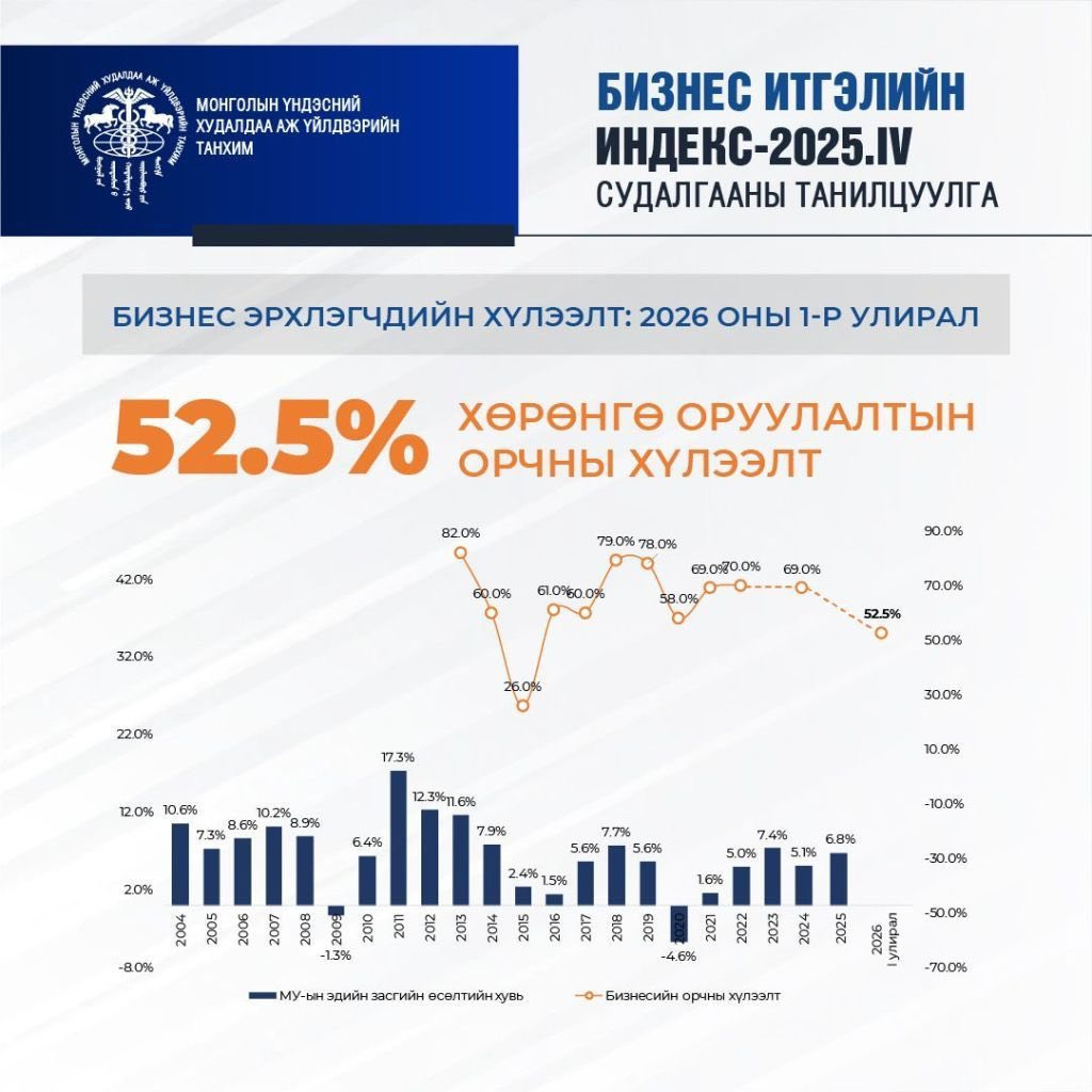 МҮХАҮТ-аас улирал бүр бэлтгэн хүргэдэг "Бизнес итгэлийн индекс"-ийн 2025 оны IV улирлын судалгааны үр дүн гарлаа. Энэхүү үзүүлэлт нь бизнес эрхлэгчид өнөөгийн нөхцөл байдлыг хэрхэн дүгнэж, ирэх 2026 оныг ямар хүлээлттэй угтаж байгааг харуулдаг чухал баримт юм.
