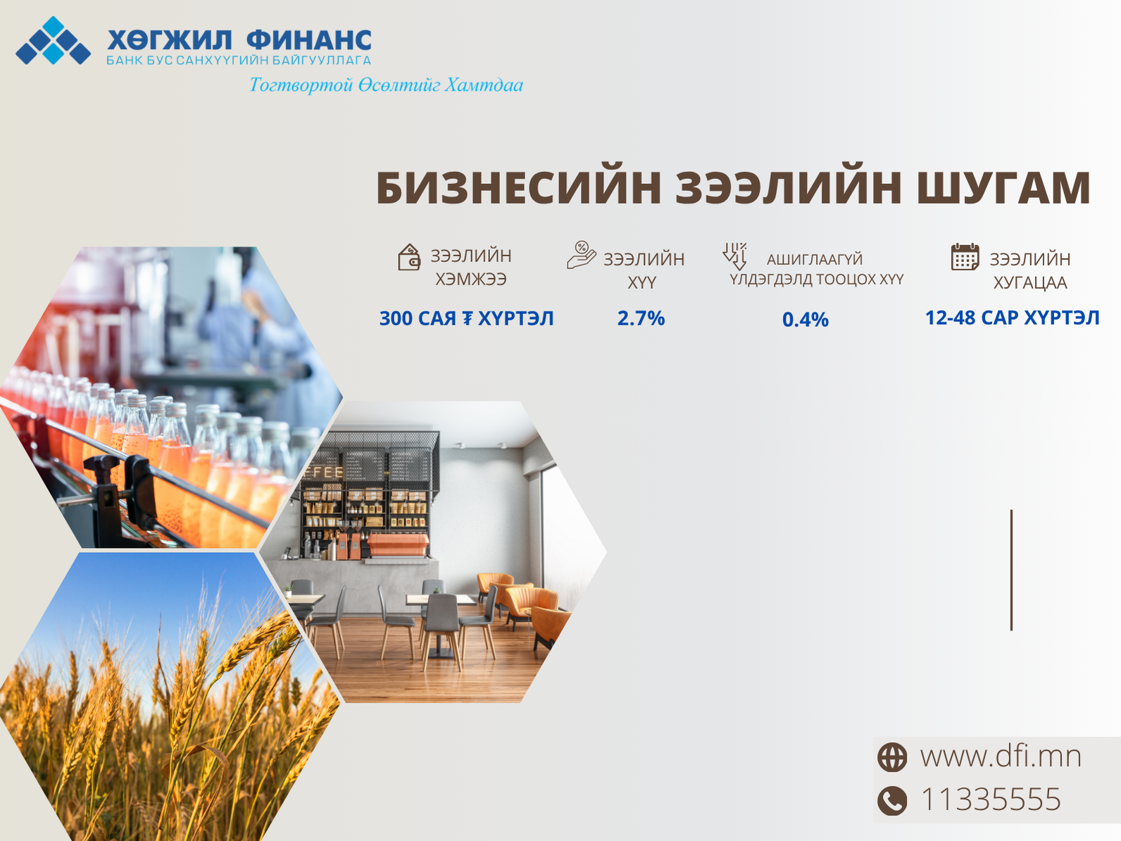 - Барьцаа хөрөнгийн уян хатан нөхцөл: 10,0 сая төгрөг хүртэл барьцаагүй, үл хөдлөх хөрөнгө болон автомашин, тоног төхөөрөмж, утасны дугаар, бараа материал зэрэг хөдлөх хөрөнгө