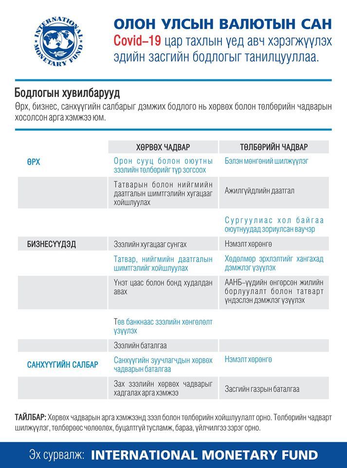 Олон улсын валютын сангаас Covid-19 цар тахлын үед авч хэрэгжүүлэх эдийн засгийн бодлогыг танилцууллаа