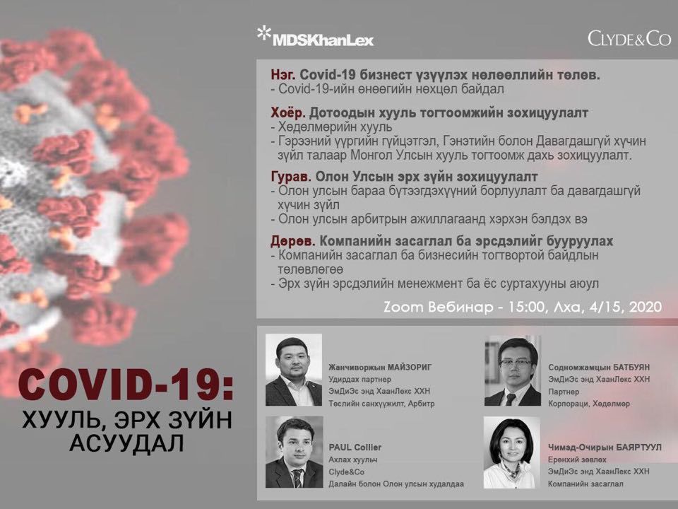 МҮХАҮТанхим Clyde&Co компанитай хамтран "COVID -19: Хууль, эрх зүйн асуудал" онлайн сургалтыг үнэ төлбөргүй 2020 оны 04-р сарын 15-нд зохион байгуулж байгаа бөгөөд Гишүүд та бүхнийг идэвхитэй оролцохыг урьж байна. Хүний тоо хязгаартай тул амжиж бүртгүүлнэ үү.