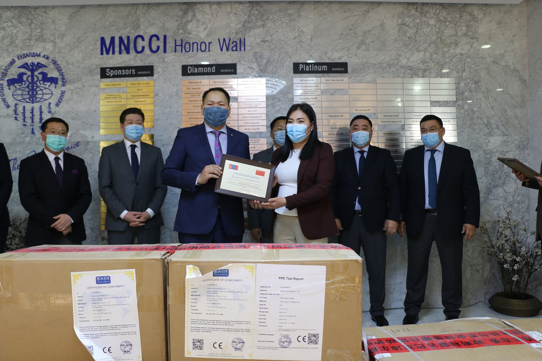 БНХАУ, ӨМӨЗО-ы Баяннуур хотын Ардын Засгийн ордон, Монгол-Баяннуур бизнес холбооноос МҮХАҮТ, ГХЯ, ХХААХҮЯ, УУЯ, Авто тээврийн үндэсний төв, Гадаадын иргэн харьяатын газарт өдөр тутмын хамгаалалтын зориулалттай 70 гаруй мянган ширхэг маскийг хандивлалаа.