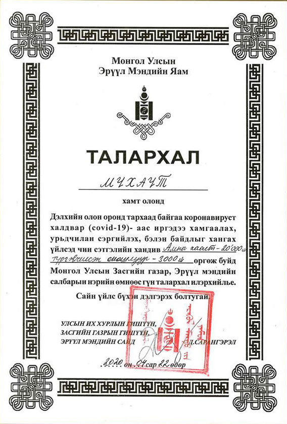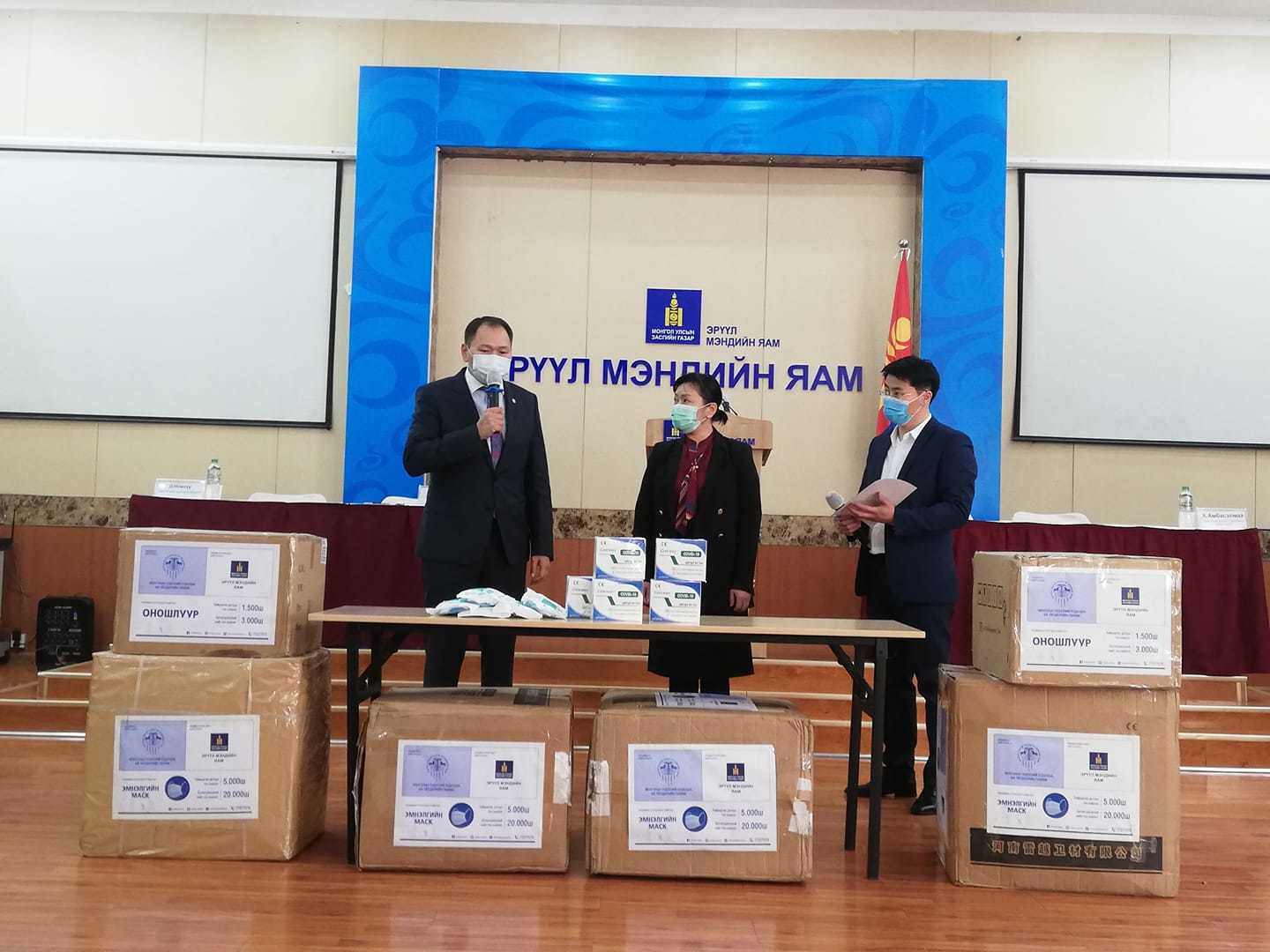 МҮХАҮТ-аас БНХАУ-ын Баяннуур аймгийн Худалдааг дэмжих хороо, Бээжин хотын худалдааг дэмжих хорооноос ирүүлсэн 20 мянган амны хаалт болон 3 мянган түргэвчилсэн оношлуурыг хүн ардынхаа амь нас, эрүүл мэндийн төлөө цаг наргүй ажиллаж буй эмч, эмнэлгийн ажилтнуудад хүргүүлэхээр ЭМЯ-нд хүлээлгэн өглөө.