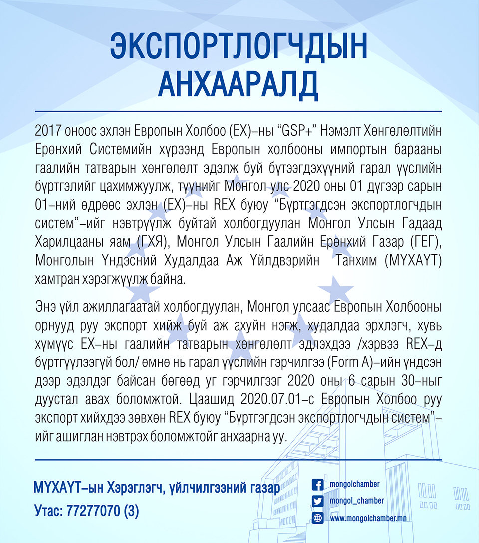 Энэ үйл ажиллагаатай холбогдуулан, Монгол улсаас Европын Холбооны орнууд руу экспорт хийж буй аж ахуйн нэгж, худалдаа эрхлэгч, хувь хүмүүс ЕХ-ны гаалийн татварын хөнгөлөлт эдлэхдээ /хэрвээ REX-д бүртгүүлээгүй бол/ өмнө нь гарал үүслийн гэрчилгээ (Form A)-ийн үндсэн дээр эдэлдэг байсан бөгөөд уг гэрчилгээг 2020 оны 6 сарын 30-ныг дуустал авах боломжтой. Цаашид 2020.07.01-с Европын Холбоо руу экспорт хийхдээ зөвхөн REX буюу “Бүртгэгдсэн экспортлогчдын систем”-ийг ашиглан нэвтрэх боломжтойг анхаарна уу.