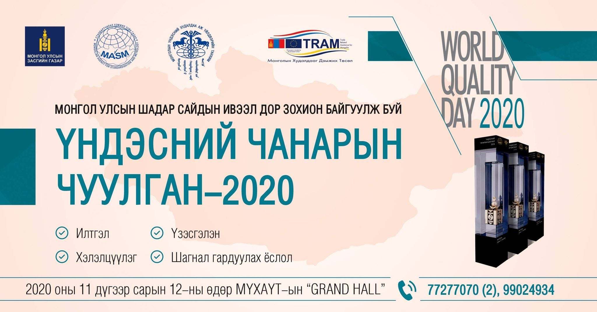 “Дэлхийн чанарын өдөр – Үндэсний чанарын 7 хоног”-ийг тэмдэглэн өнгөрүүлэх ажлын хүрээнд 6 дахь жилдээ Үндэсний чанарын шагналтныг тодруулах гэж байна. Шагнал гардуулах ёслолын ажиллагаа 2020 оны 11-р сарын 12-ны 13 цагт МҮХАҮТ-д болно.