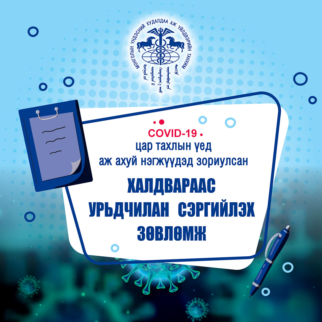 Ковид-19 цар тахлын үед аж ахуй нэгжүүдэд зориулсан халдвараас урьдчилан сэргийлэх зөвлөмжүүдийг нэгтгэн хүргэж байна. Зөвлөмжийг энд дарж татаж үзнэ үү.