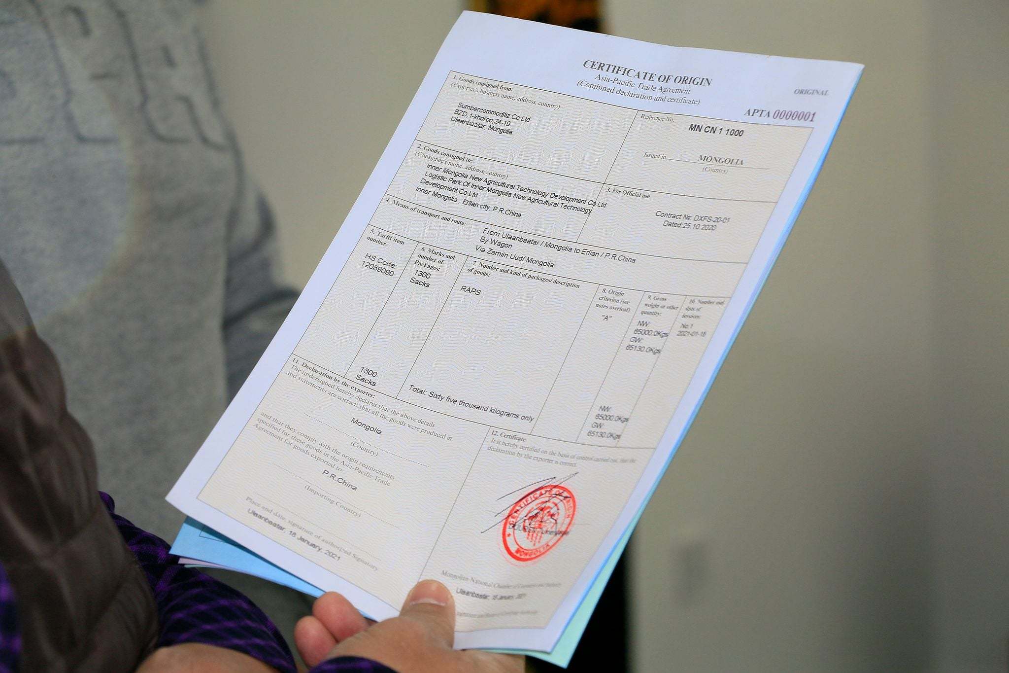 Монгол Улс Ази, Номхон Далайн Худалдааны хэлэлцээр (АНДХХ)-ийн 7 дахь албан ёсны гишүүн улс болж, 2021 оны эхний өдрөөс энэ хэлэлцээр хэрэгжиж эхлээд байна. Өнөөдөр энэхүү хэлэлцээрийн хүрээнд, Монгол Улсаас БНХАУ руу эскпорт хийх хамгийн эхний буюу 01 дугаартай АНДХХ-ийн гарал үүслийн гэрчилгээг МҮХАҮТ-ын гишүүн “Сүмбэр коммодит” ХХК-ний рапсанд олголоо. Ингэснээр БТКУС-ийн 120051090 кодтой рапс хэлэлцээр хэрэгжихээс өмнө 6%-ийн гаалийн татвартай байсан бол хэлэлцээр хэрэгжсний дараа 100%-ийн гаалийн тарифын хөнгөлөлтийг эдлэх боломжтой болж байна.