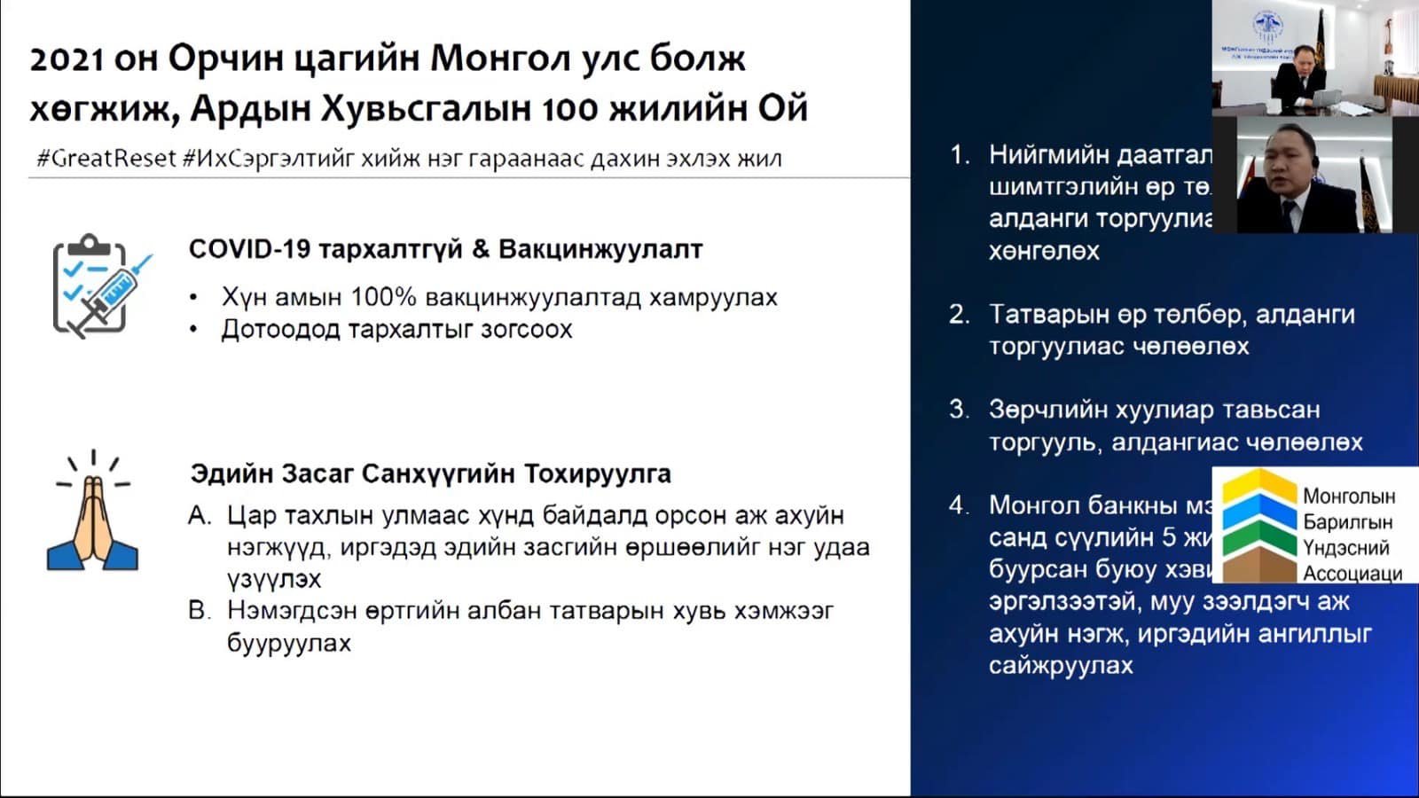 Тус хэлэлцүүлгийн эхэнд МҮХАҮТ-ын Ерөнхийлөгч О.Амартүвшин “Ковидын дараах эдийн засгийн Их сэргэлт” санаачилгын талаар оролцогчдод танилцууллаа. Эдийн засгийг тэлэхийн тулд экспорт, гадаадын хөрөнгө оруулалтыг нэмэгдүүлэх шаардлагатай. Эдийн засаг, худалдаа, хөрөнгө оруулалтыг хариуцсан яамыг байгуулах, Мэргэжлийн холбоодод суурилсан төр-хувийн хэвшлийн хамтын ажиллагааг зөв хөгжүүлэх, Татвар, Нийгмийн даатгал, Зөрчлийн өр төлбөрөөс чөлөөлж дэмжлэг үзүүлэх замаар эдийн засгийн тохируулга хийх, НӨАТ-ын хувь хэмжээг бууруулах, ковидын улмаас үүссэн эдийн засгийн хямралын дараах гарааны тэгш боломжийг олгох, Төрийн өмчит болон төрийн өмчийн оролцоотой аж ахуйн нэгжүүдийн засаглал, удирдлагын тогтолцоонд шинэчлэл хийх, хувьчлах болон зөвшөөрлийн тоог цөөлөх, зөвшөөрөл олгох үйл явцыг хялбаршуулах, ил тод болгох зэргээр саад болж байгаа олон асуудлуудад цэг тавих хэрэгтэй байгааг онцоллоо.