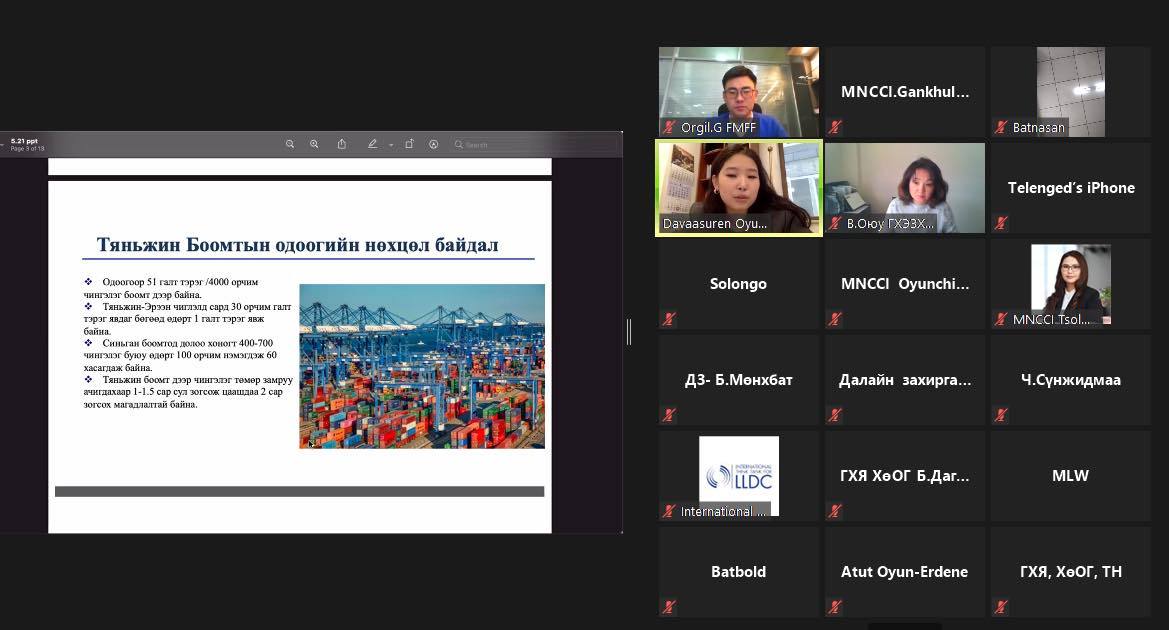 Уулзалтаар Тяньжин боомтын төмөр замын тээвэр, Замын-Үүд-Эрээн боомтын авто тээвэрт үүсээд буй нөхцөл байдал, Алтанбулаг боомтын тээвэрлэлтийн горимыг өөрчлөх шаардлагын талаар МТЗНХ-оос мэдээлэл өгч, ГХЯ, Авто тээврийн үндэсний төвөөс асуудлыг шийдвэрлэх талаар хийж байгаа ажлын явцыг танилцуулсан бөгөөд цаашид авах арга хэмжээний талаар нийт оролцогчид санал солилцлоо.