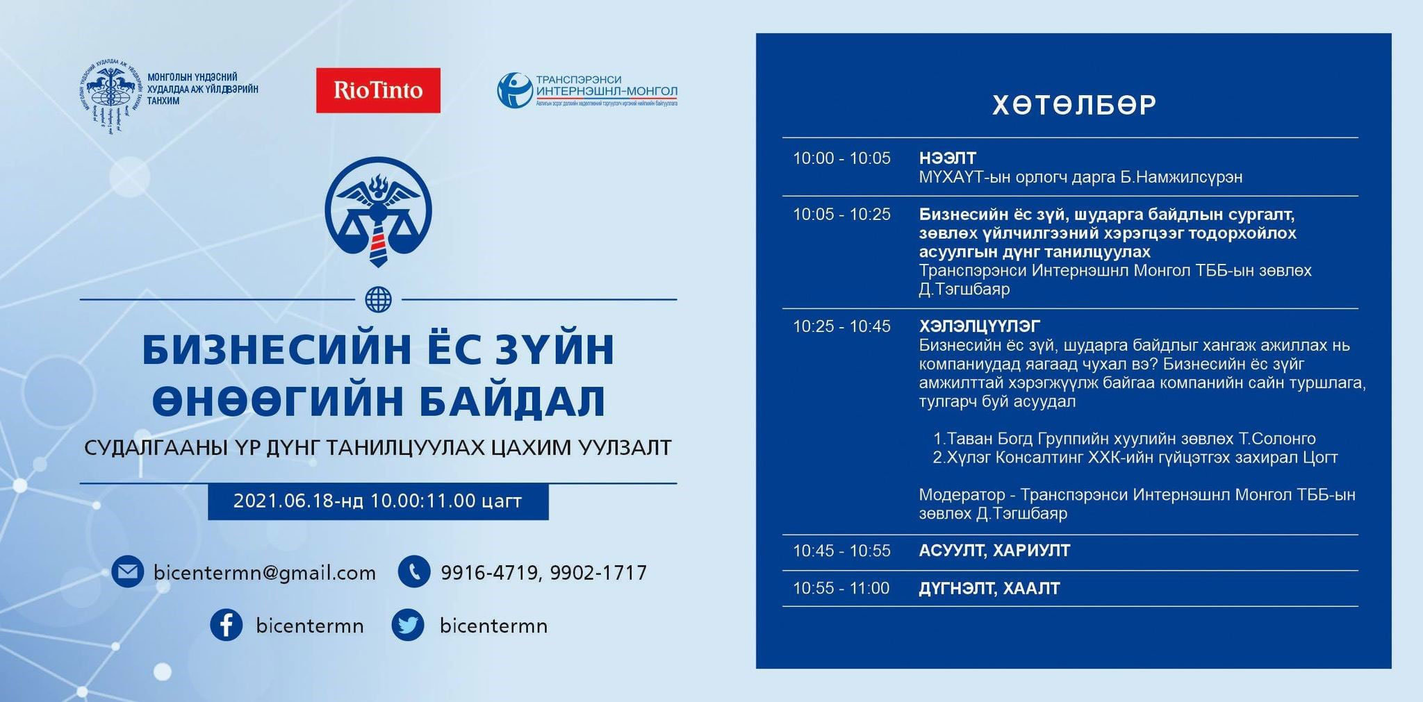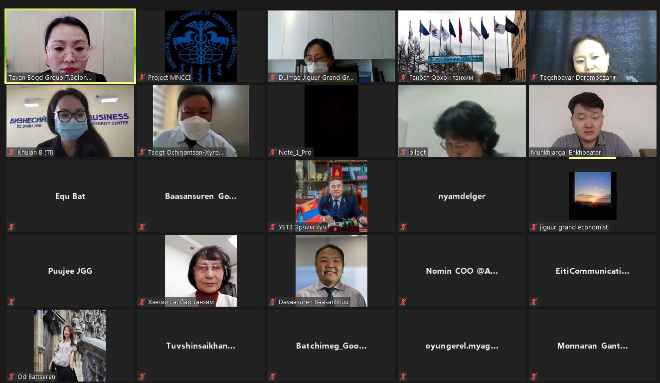 МҮХАҮТ-ын дэргэдэх Бизнесийн Ёс Зүйн Төвөөс бизнесийн байгууллага дахь ашиг сонирхлын зөрчил болон ёс зүйн хоёрдмол байдалд орох эрсдэлээс бизнесээ хэрхэн хамгаалах ойлголтыг нэмэгдүүлэх, авлигаас урьдчилан сэргийлэх, засаглалыг бэхжүүлэхэд шаардлагатай сургалт болон зөвлөх үйлчилгээний хэрэгцээг тодорхойлох судалгааны дүнг танилцуулах, бизнесийн ёс зүй, шударга байдлыг дэмжиж ажиллах нь компаниудад ямар үр өгөөжтэй талаар нээлттэй санал солилцох уулзалтыг цахимаар зохион байгууллаа. Уулзалтад хот болон орон нутгийн нийт 50 гаруй аж ахуйн нэгж, байгууллагын төлөөлөл оролцлоо.