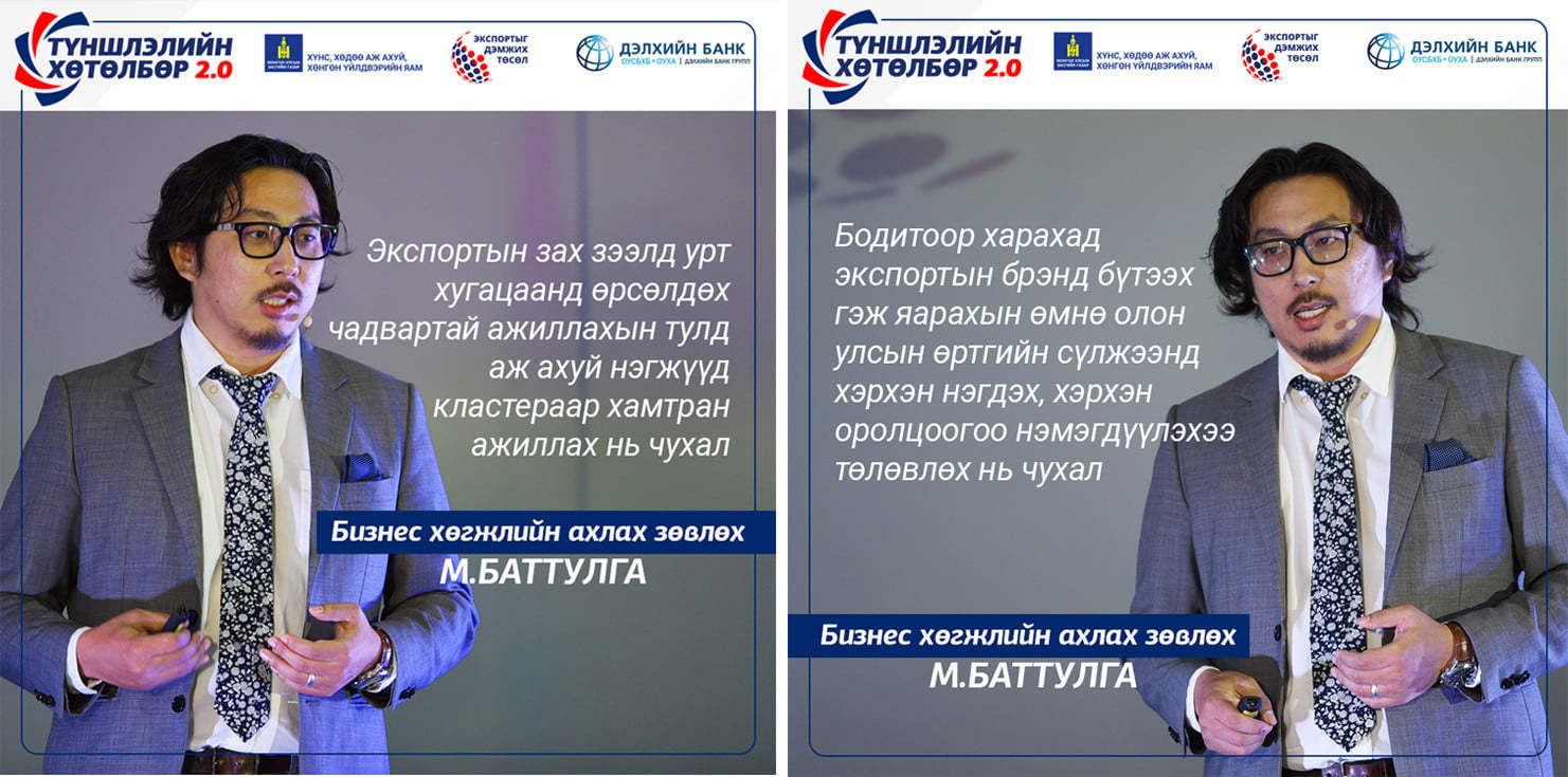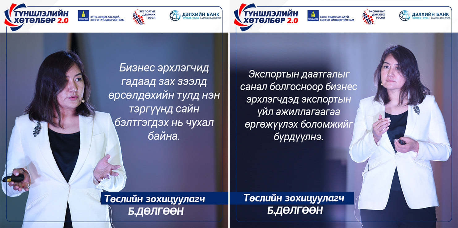 Тус арга хэмжээнд “Экспортыг дэмжих төсөл”-ийн зохицуулагч Б.Дөлгөөн “Экспортыг дэмжих төслийн шийдлүүд”, тус төслийн бизнес хөгжлийн ахлах зөвлөх, түншлэлийн хөтөлбөрийн багийн ахлагч М.Баттулга “Экспортлогчдыг дэмжсэн санхүүгийн түншлэл” сэдвийн хүрээнд танилцууллаа.