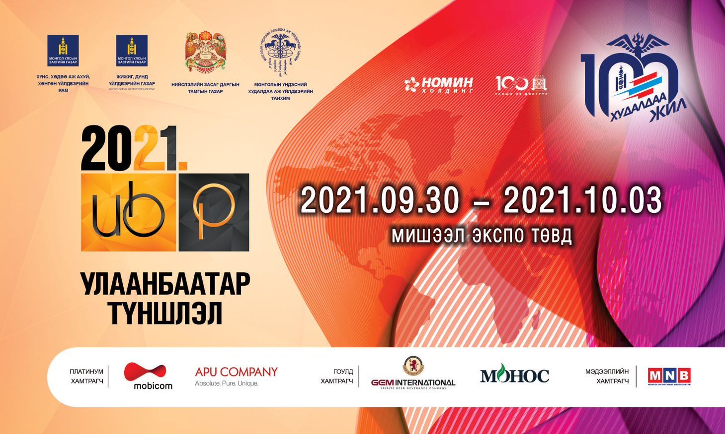 Монгол Улсад худалдааны салбар үүсэж хөгжсөний 100 жилийн ойн арга хэмжээний хүрээнд ХХААХҮЯ, МҮХАҮТ, НЗДТГ, ЖДҮГ-тай хамтран жил бүр уламжлал болгон зохион байгуулдаг “Улаанбаатар Түншлэл-2021“ Олон улсын үзэсгэлэнг зохион байгуулах гэж байна. 46 дахь жилдээ зохион байгуулагдах тус үзэсгэлэн 9 дүгээр сарын 30-наас 10 дугаар сарын 3-ны өдрүүдэд Мишээл экспо төвд болно.