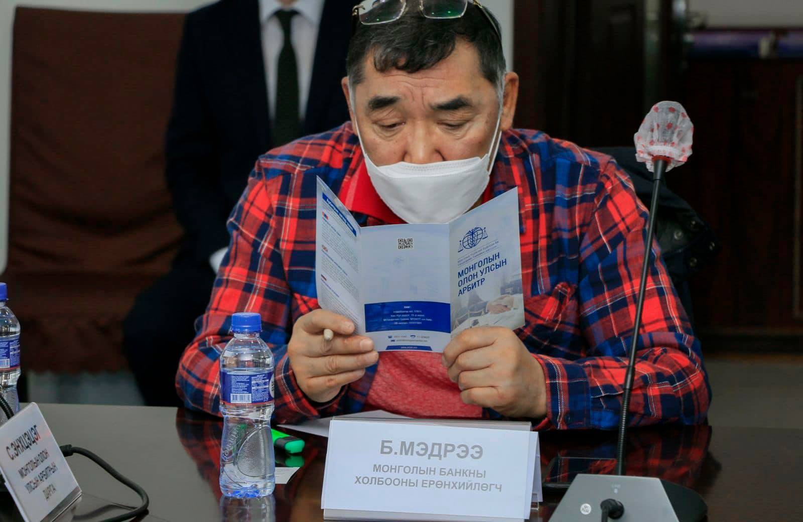 МҮХАҮТ-ын дэргэдэх Монголын Олон Улсын Арбитрын ажлын албанаас Монголын Банкны холбоотой “Банкны үйл ажиллагаан дахь гэрээнээс үүдэлтэй маргааныг арбитрын журмаар хянан шийдвэрлэх нь” сэдэвт уулзалт, хэлэлцүүлгийг зохион байгууллаа. Уулзалтын эхэнд Монголын Олон Улсын Арбитрын Ерөнхий нарийн бичгийн дарга М.Шинэбаяр Шүүх болон арбитрын хэргийн харьяалал, зээлийн гэрээний маргааныг шийдвэрлэж буй шүүх ба арбитрын харьцуулалт, Арбитрын журмаар хэрэг хянан шийдвэрлэх онцлог, давуу талын талаар мэдээлэл хийв.