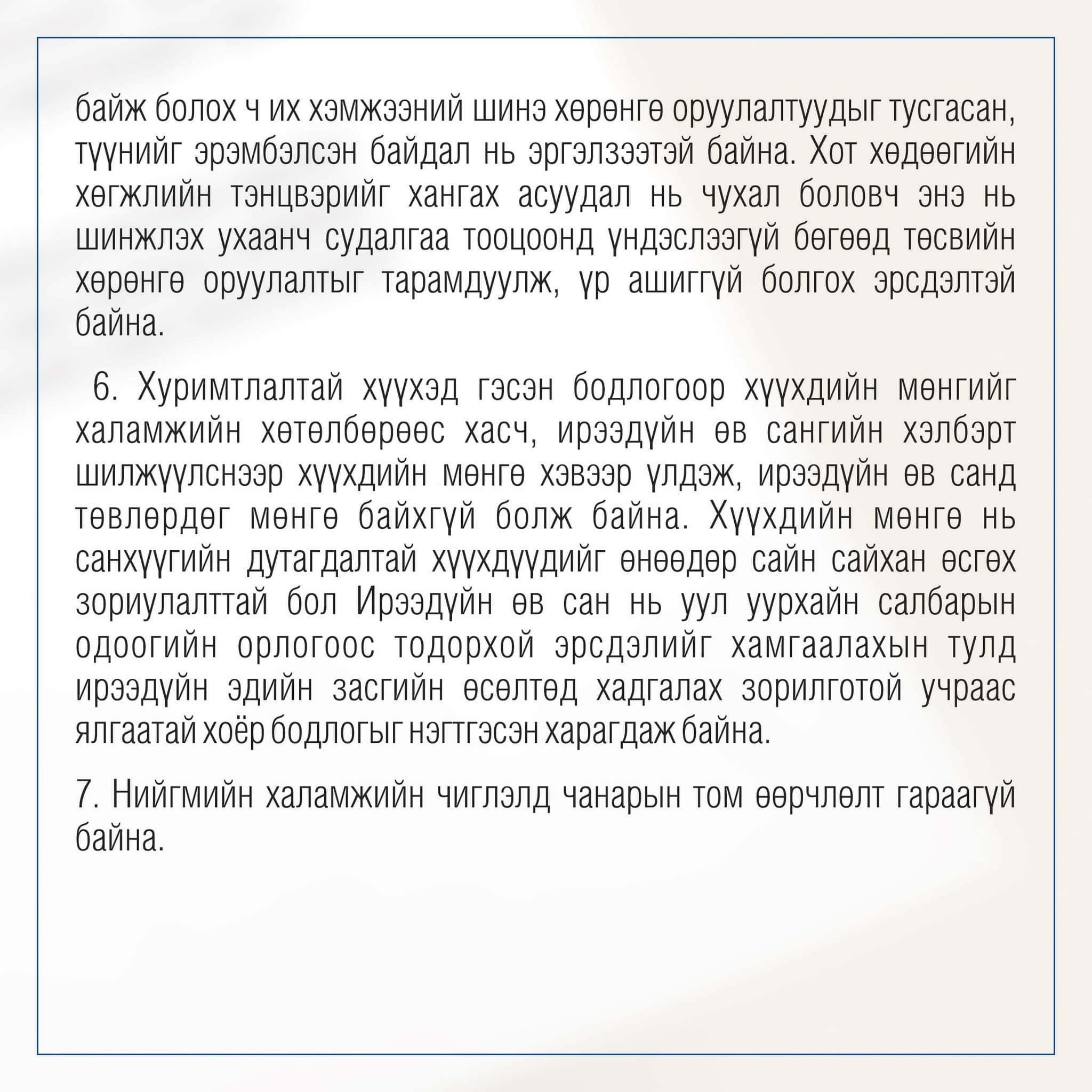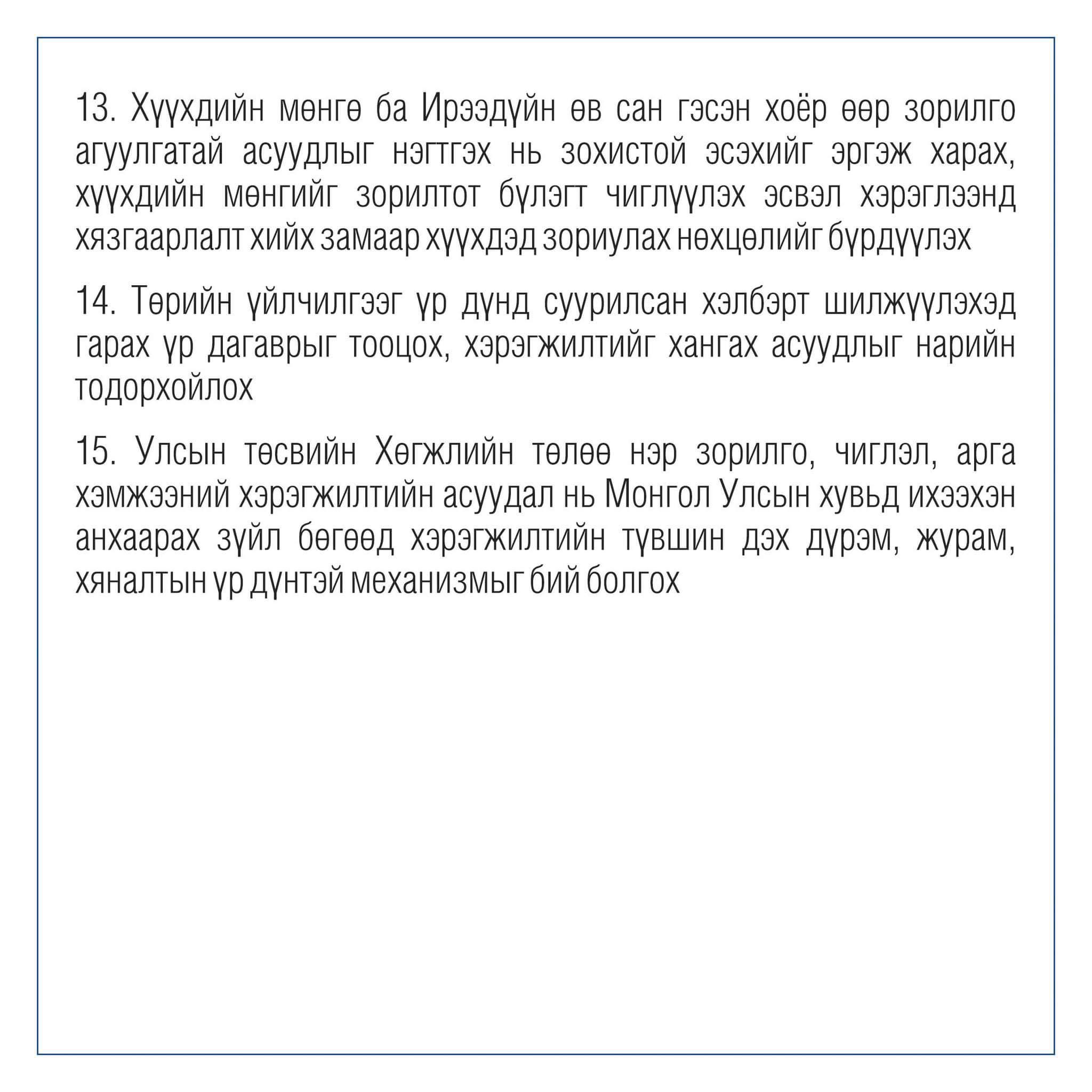 - Нийгмийн халамжийн чиглэлд чанарын том өөрчлөлт гаргах, халамжаас хөдөлмөрт шилжих дорвитой шинэчлэл, арга хэмжээг төлөвлөх