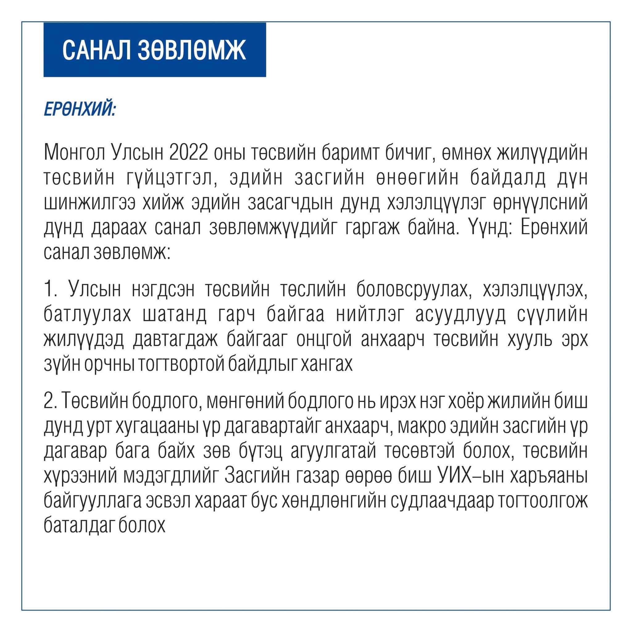 2022 оны төсөвт хамаарах санал зөвлөмж: