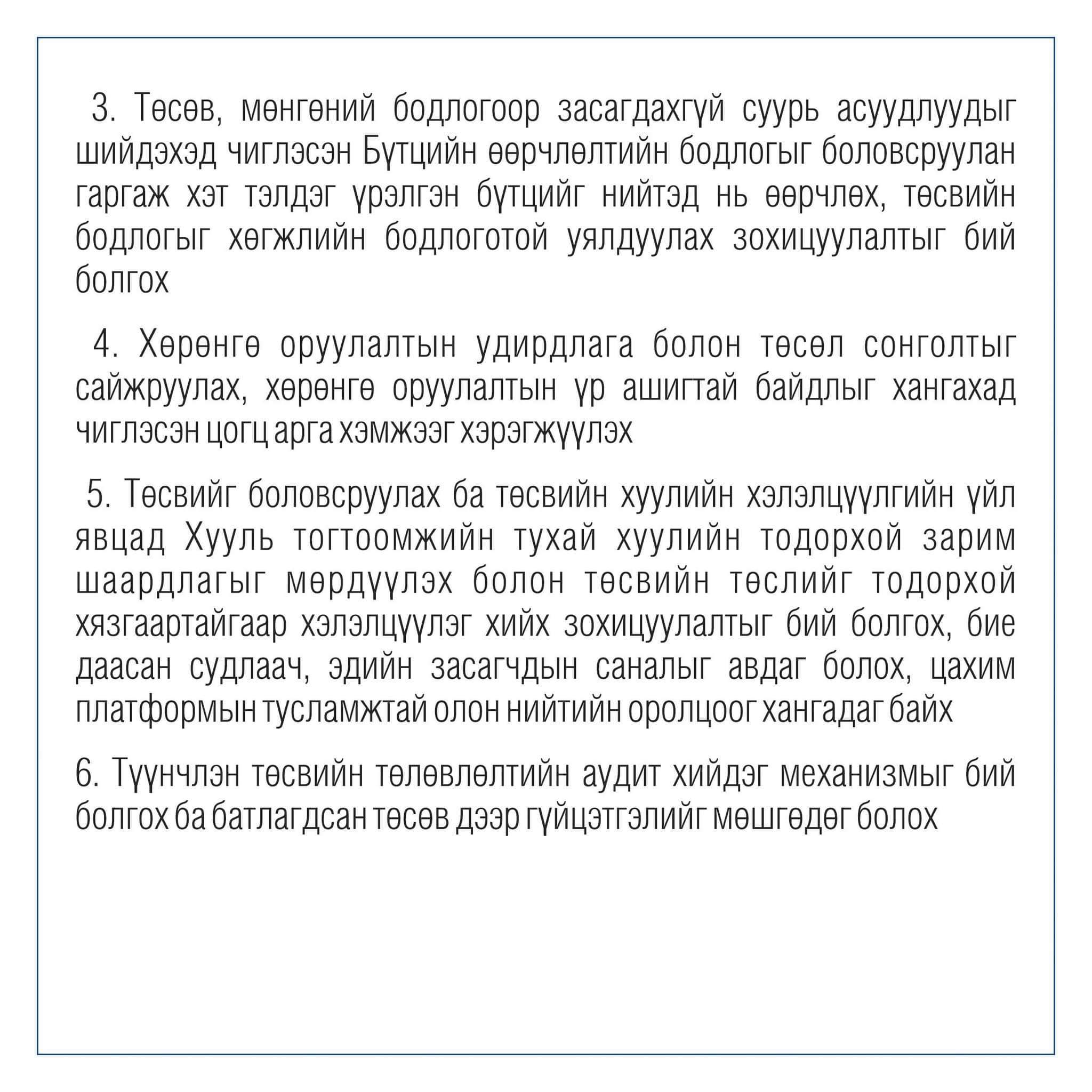 - Түүнчлэн төсвийн төлөвлөлтийн аудит хийдэг механизмыг бий болгох ба батлагдсан төсөв дээр гүйцэтгэлийг мөшгөдөг болох