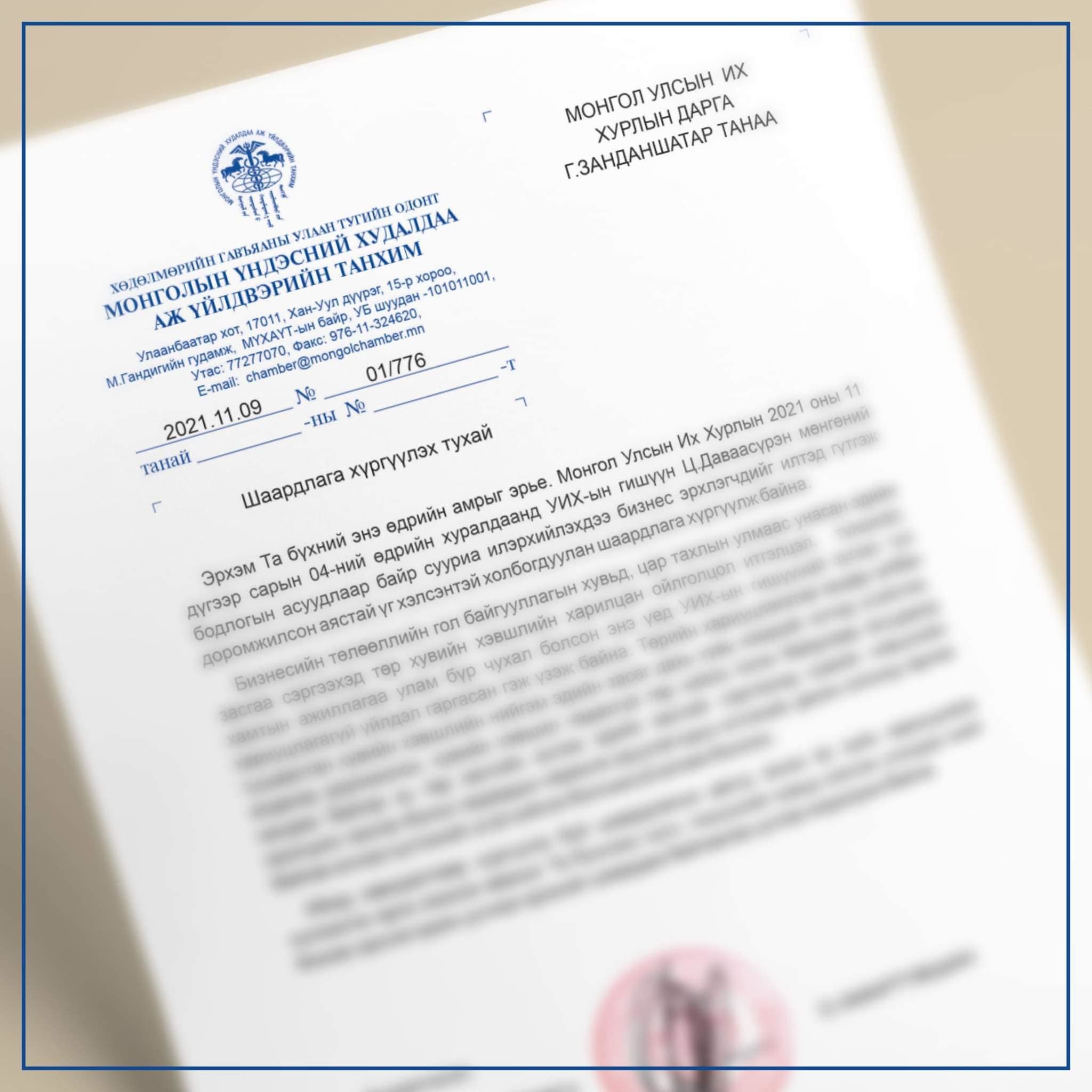 МҮХАҮТ-аас УИХ-ын дарга Г.Занданшатар, УИХ дахь Монгол Ардын намын бүлгийн дарга Д.Тогтохсүрэн, УИХ-ын Ёс зүйн дэд хорооны дарга Б.Бат-Эрдэнэ болон УИХ-ын гишүүн Ц.Даваасүрэн нарт шаардлага хүргүүллээ.