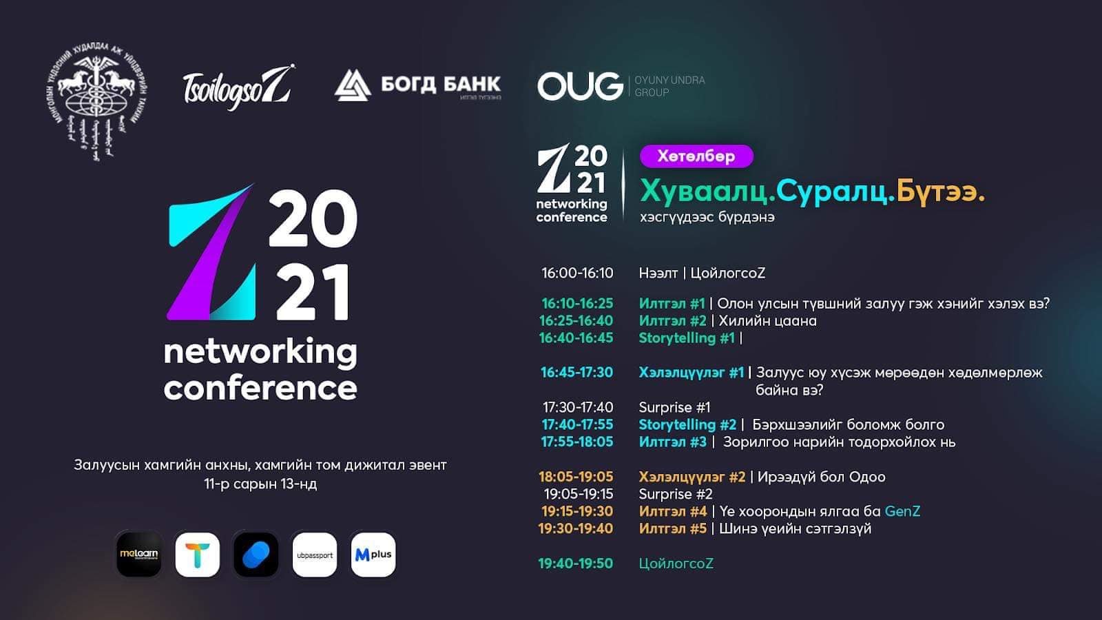 Залуусын оюунд хөрөнгө оруулах бэлгүүдийг задлах "Z networking conference-2021" нь цар тахлаас үүдэн цахим болон танхимаар зэрэг явагдах бөгөөд цахимаар 100 мянга гаруй залуус оролцоно.