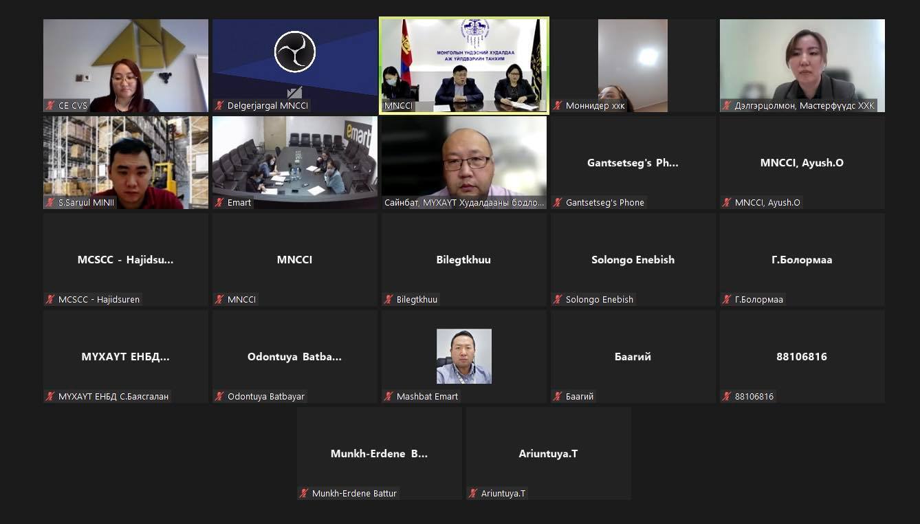 Худалдаа, үйлчилгээний салбарт төрийн хяналт, шалгалтыг бууруулахтай холбоотойгоор шинэчлэх, сайжруулах шаардлагатай хууль, дүрэм, журам, стандартуудын талаар ярилцаж, санал боловсруулан Засгийн газар хүргүүлэх цахим уулзалтад МҮХАҮТ-ын дэргэдэх Худалдааны бодлогын зөвлөл болон худалдааны салбарын компаниудын төлөөлөл оролцов.