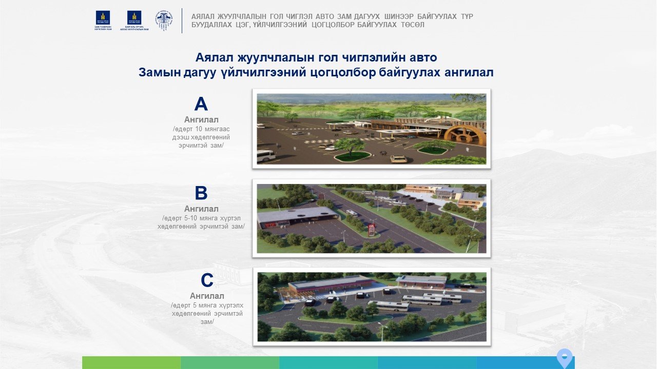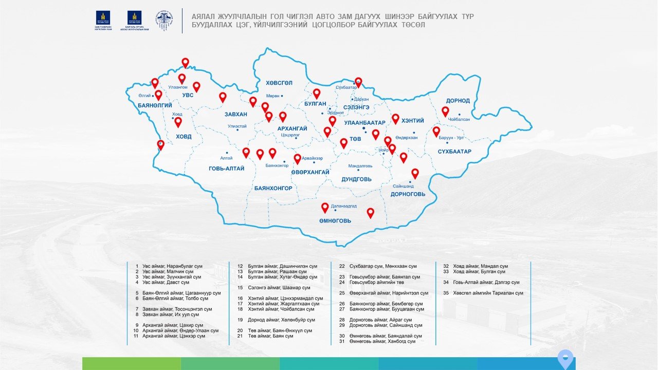 Аялал жуулчлалын гол чиглэл, олон улс, улсын чанартай авто зам дагуу түр буудаллах цэг, үйлчилгээний цогцолбор байгуулах 35 байршлыг танилцуулж байна.