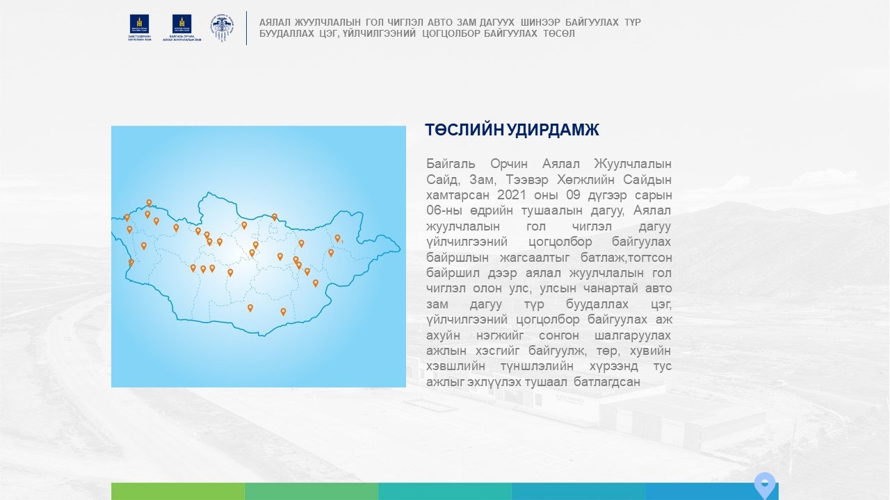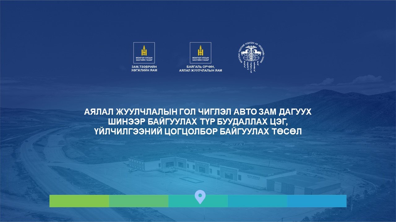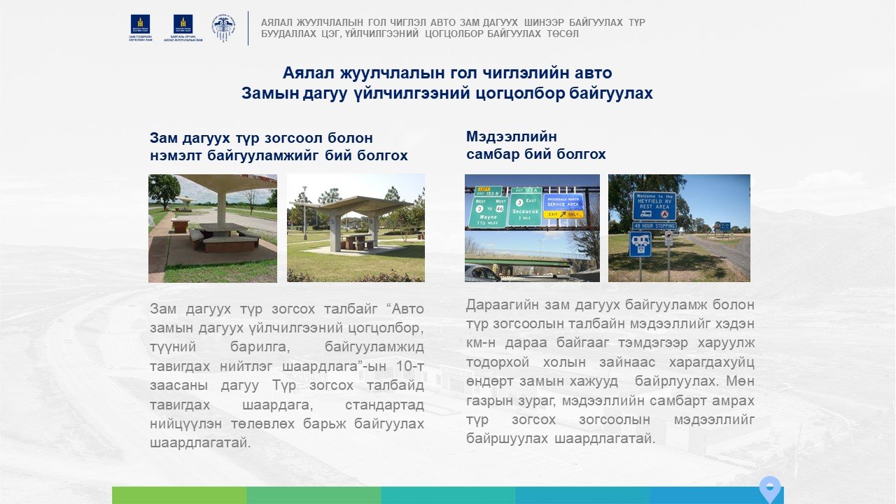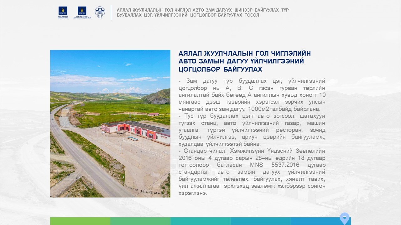 Монгол Улсын Засгийн газар-ын 2020-2024 оны үйл ажиллагааны хөтөлбөр болон Төрөөс аялал жуулчлалыг хөгжүүлэх талаар баримтлах бодлогод тусгагдсаны дагуу Аялал жуулчлалын гол чиглэл дагуух үйлчилгээний цогцолбор бүхий түр буудаллах цэгүүдийг байгуулахаар Байгаль орчин, аялал жуулчлалын сайд, Зам, тээврийн хөгжлийн сайд нарын хамтарсан тушаалаар ажлын хэсэг байгуулагдан, аж ахуйн нэгжүүдийг сонгон шалгаруулаад байна.