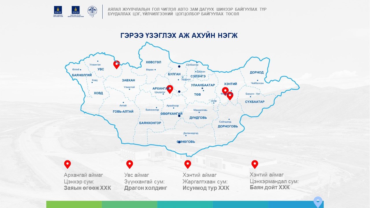 - Хэнтий аймгийн Цэнхэрмандал сум: “Баян дойт” ХХК тус тус шалгарсан бөгөөд МҮХАҮТ-тай хамтран ажиллах гэрээ байгуулж, бүтээн байгуулалтын ажлаа эхлүүлэх боломжтой боллоо. Эдгээр компаниуд 800 саяас 3.2 тэрбум төгрөгийн хөрөнгө оруулалт хийж, үйлчилгээний цогцолбор байгуулах бөгөөд цаашид менежментийг хариуцан ажиллана.