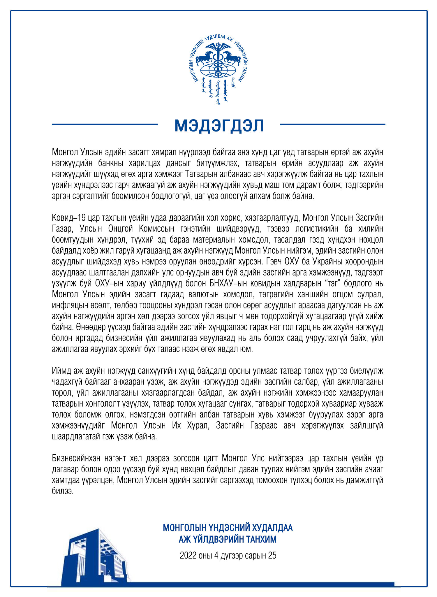 Ковид-19 цар тахлын үеийн удаа дараагийн хөл хорио, хязгаарлалтууд, Монгол Улсын Засгийн Газар, Улсын Онцгой Комиссын гэнэтийн шийдвэрүүд, тээвэр логистикийн ба хилийн боомтуудын хүндрэл, түүхий эд бараа материалын хомсдол, тасалдал гээд хүндхэн нөхцөл байдалд хоёр жил гаруй хугацаанд аж ахуйн нэгжүүд Монгол Улсын нийгэм, эдийн засгийн олон асуудлыг шийдэхэд хувь нэмрээ оруулан өнөөдрийг хүрсэн. Гэвч ОХУ ба Украйны хоорондын асуудлаас шалтгаалан дэлхийн улс орнуудын авч буй эдийн засгийн арга хэмжээнүүд, тэдгээрт үзүүлж буй ОХУ-ын хариу үйлдлүүд болон БНХАУ-ын ковидын халдварын “тэг” бодлого нь Монгол Улсын эдийн засагт гадаад валютын хомсдол, төгрөгийн ханшийн огцом сулрал, инфляцын өсөлт, төлбөр тооцооны хүндрэл гэсэн олон сөрөг асуудлыг араасаа дагуулсан нь аж ахуйн нэгжүүдийн эргэн хөл дээрээ зогсох үйл явцыг ч мөн тодорхойгүй хугацаагаар үгүй хийж байна. Өнөөдөр үүсээд байгаа эдийн засгийн хүндрэлээс гарах нэг гол гарц нь аж ахуйн нэгжүүд болон иргэдэд бизнесийн үйл ажиллагаа явуулахад нь аль болох саад учруулахгүй байх, үйл ажиллагаа явуулах эрхийг бүх талаас нээж өгөх явдал юм.