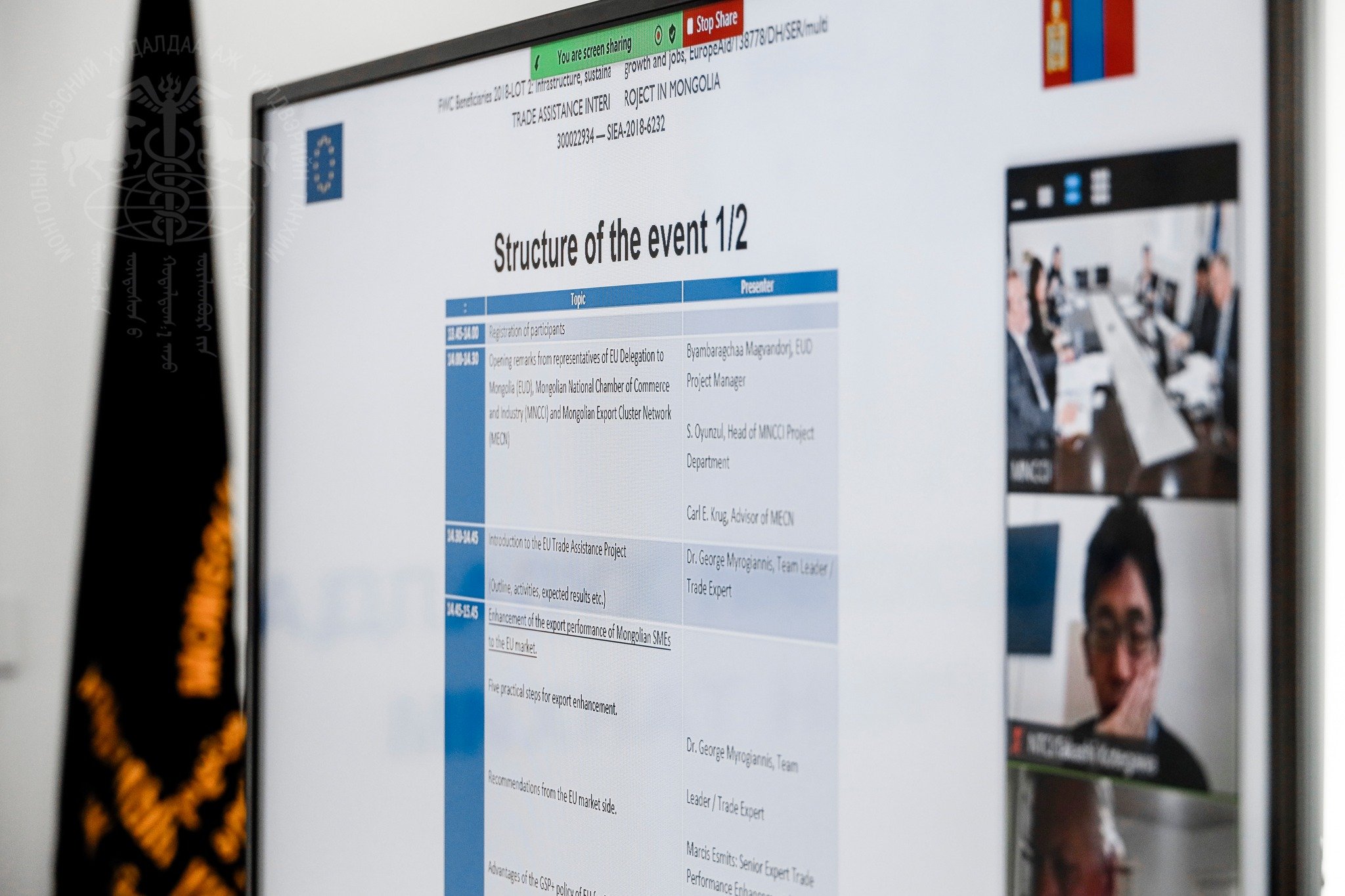 Европын Холбооны санхүүжилтээр Монголын Үндэсний Худалдаа Аж Үйлдвэрийн Танхим, “Монголын экспортын кластеруудын сүлжээ” ТББ-тай хамтран хэрэгжүүлж буй “Монгол Улсын худалдаанд дэмжлэг үзүүлэх” төслийн хамтын ажиллагаа, түншлэлийн хүрээнд энэ онд нийт есөн багц сургалт, семинар зохион байгуулна. Дээрх сургалтуудын эхнийх “Монголын гоо сайхны бүтээгдэхүүнийг ЕХ-руу экспортлох үйл ажиллагааг сайжруулах нь” сэдэвт сургалт өнөөдөр болж, “Монголын Гоо сайхны бүтээгдэхүүний кластер” ТББ-ын гишүүн байгууллагуудын 25 төлөөлөл танхим болон цахимаар оролцлоо.