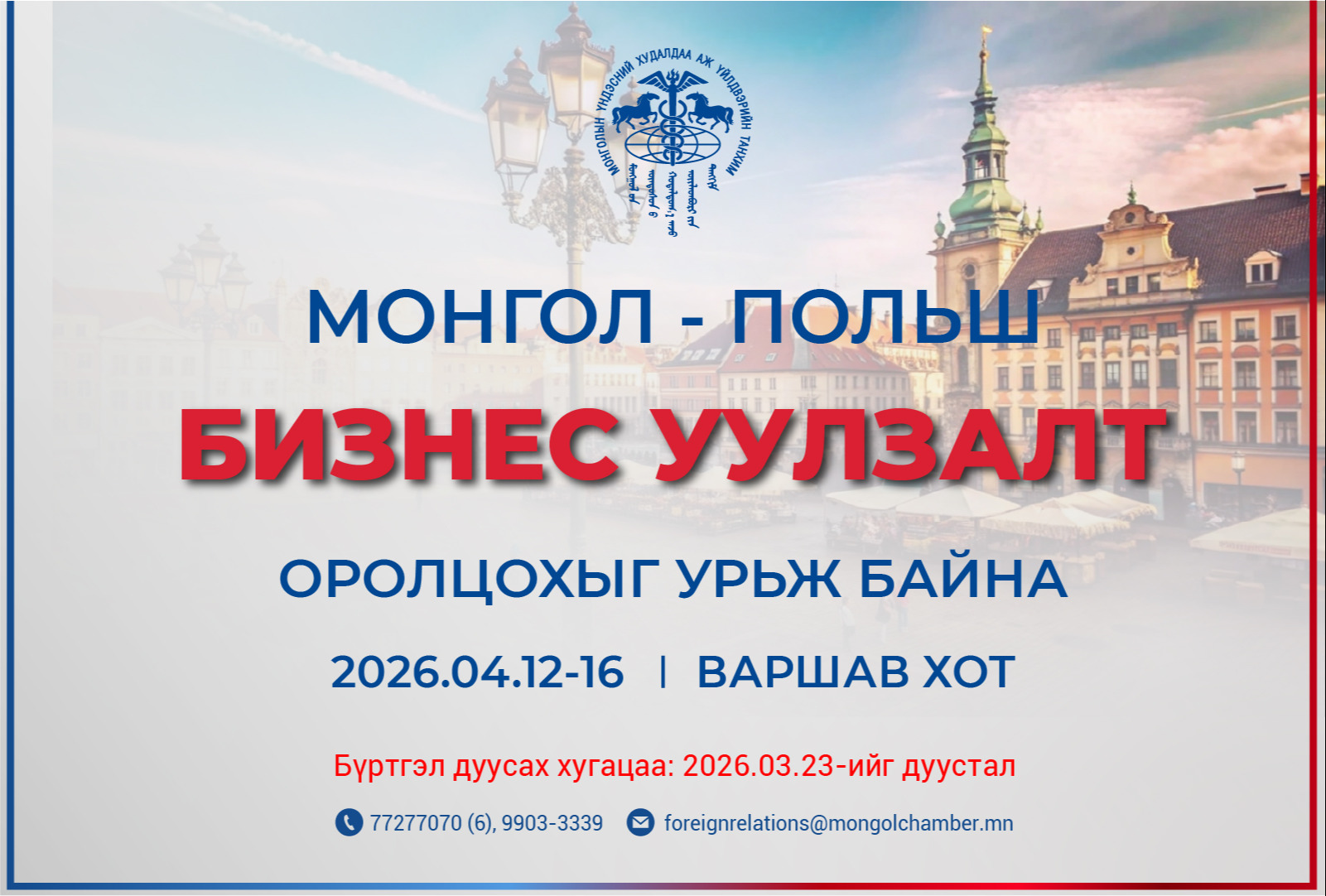 Монголын Үндэсний Худалдаа Аж Үйлдвэрийн Танхим болон Монгол–Польшийн Парламентын бүлэг хамтран 2026 оны 4 дүгээр сарын 12–20-ны өдрүүдэд Бүгд Найрамдах Польш Улсын Варшав хотноо “Монгол–Польшийн бизнес уулзалт, аялал” арга хэмжээг зохион байгуулна.