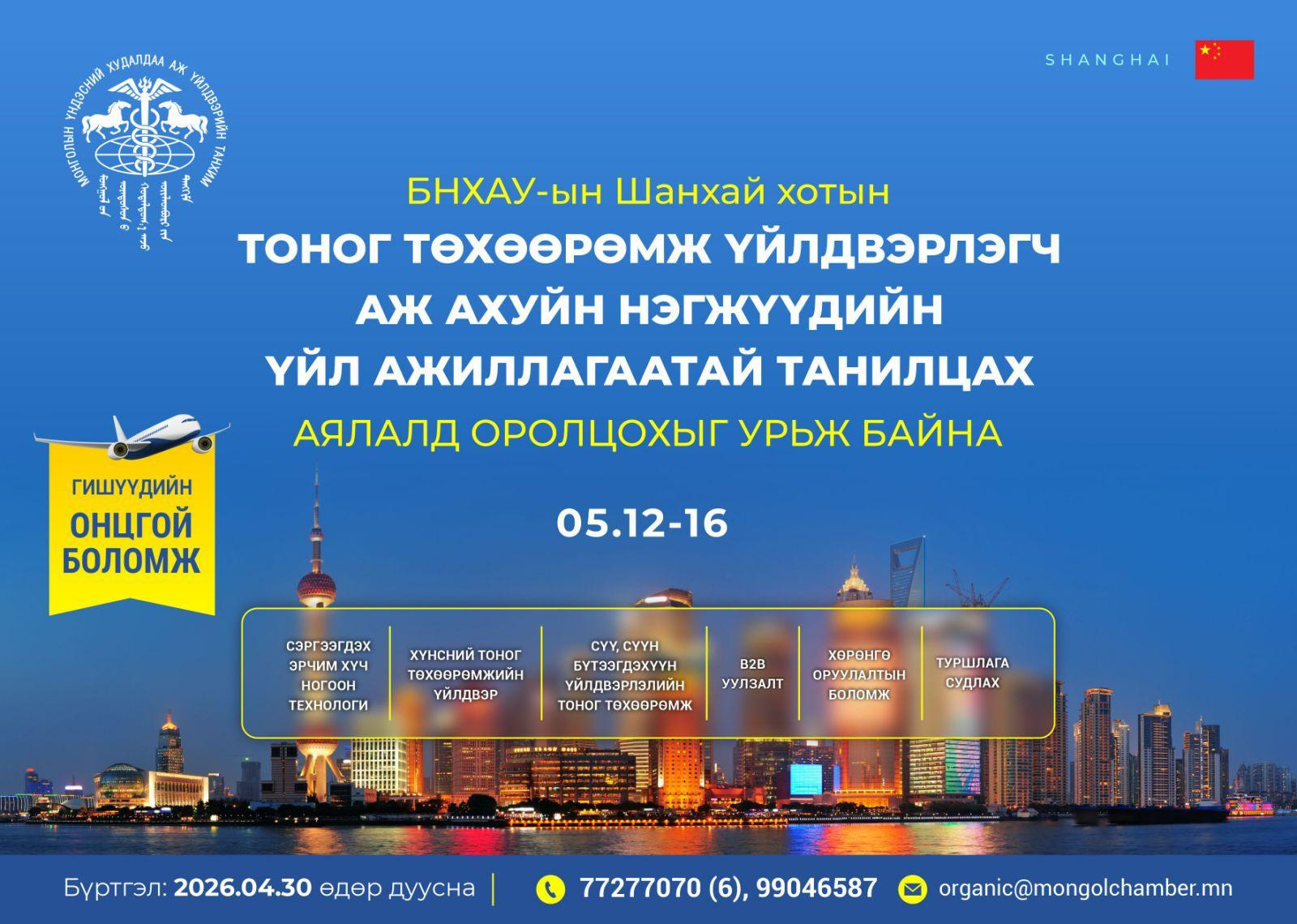 МҮХАҮТанхим нь БНХАУ-ын Худалдааг дэмжих хороотой хамтын ажиллагааны хүрээнд гишүүн байгууллагууддаа хөнгөлөлттэй үнээр БНХАУ-ын Шанхай хотын тоног төхөөрөмж үйлдвэрлэгч аж ахуйн нэгжүүдийн үйл ажиллагаатай танилцах, туршлага судлах, В2В уулзалт, хөрөнгө оруулалтын боломжуудыг гишүүддээ олгох зорилгоор тус аялалыг зохион байгуулах гэж байна.