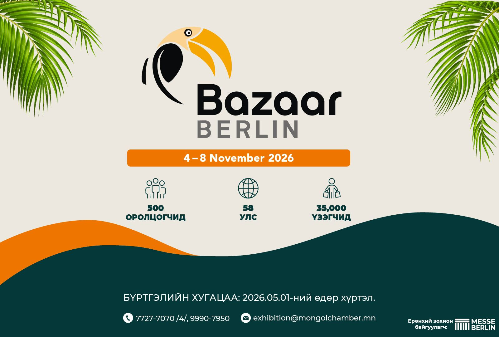 Монголын Үндэсний Худалдаа, Аж Үйлдвэрийн Танхимаас ХБНГУ-ын нийслэл Берлин хотноо зохион байгуулагддаг “Bazaar Berlin 2026” Дэлхийн соёл, бүтээлч үйлдвэрлэлийн өнгө төрхийг нэг дор цогцлоосон олон улсын үзэсгэлэнд оролцохыг бизнес эрхлэгчид, үндэсний үйлдвэрлэгчид, гишүүн байгууллагууддаа урьж байна.
